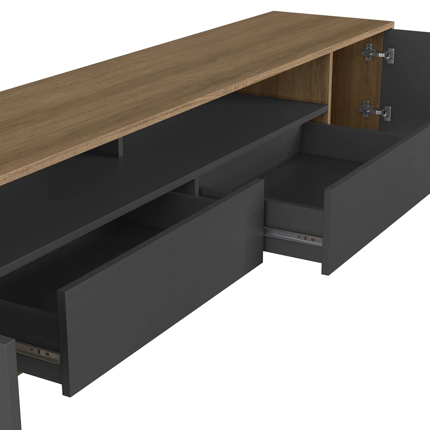O móvel conta com duas portas com dobradiças metálicas e duas gavetas com corrediças telescópicas, garantindo durabilidade e abertura suave. Tanto as portas quanto as gavetas não possuem puxadores, mas oferecem total praticidade no uso.