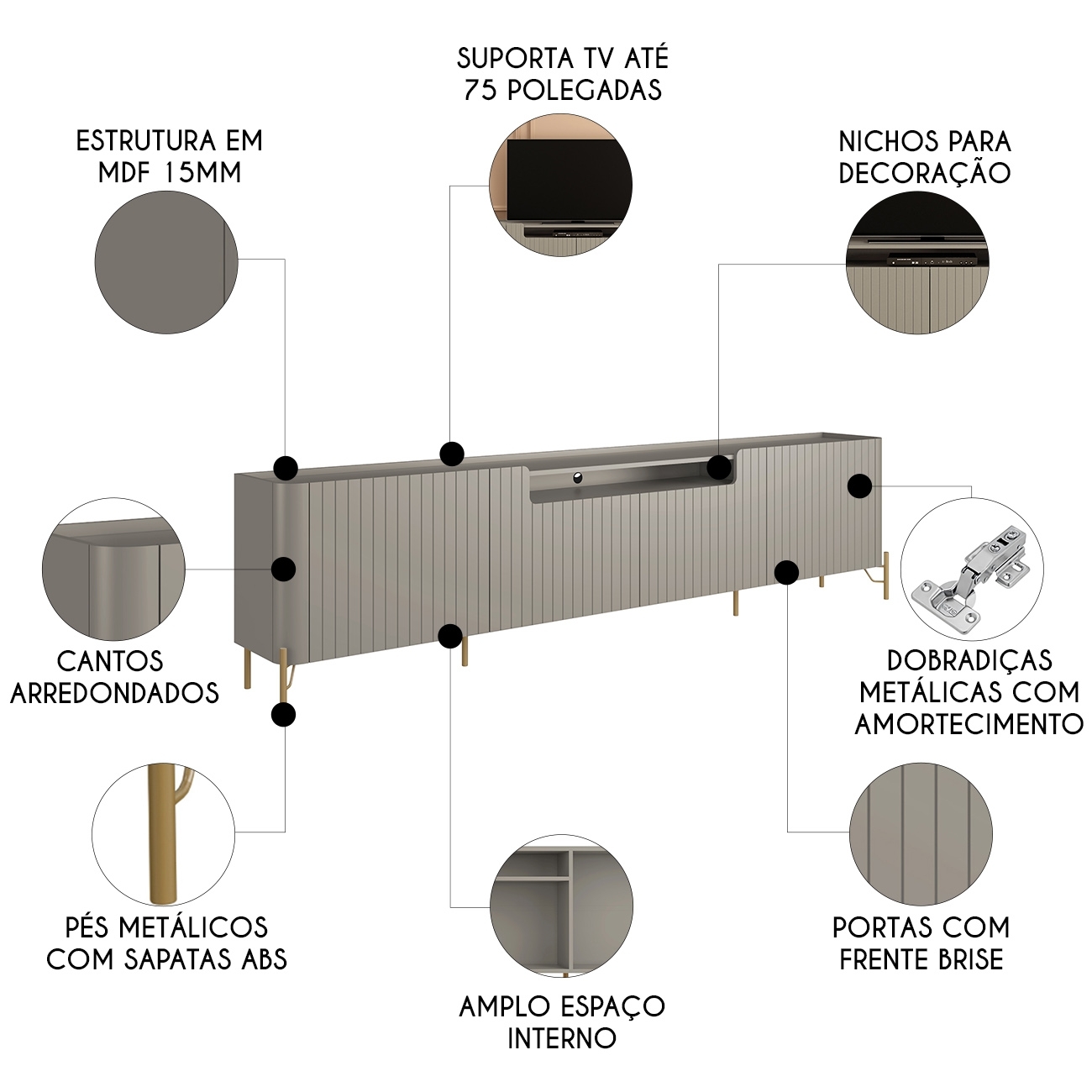 Rack TV 75 Pol 220cm 4 Portas Brise Blen Grigio/Dourado I06 - Mpozenato