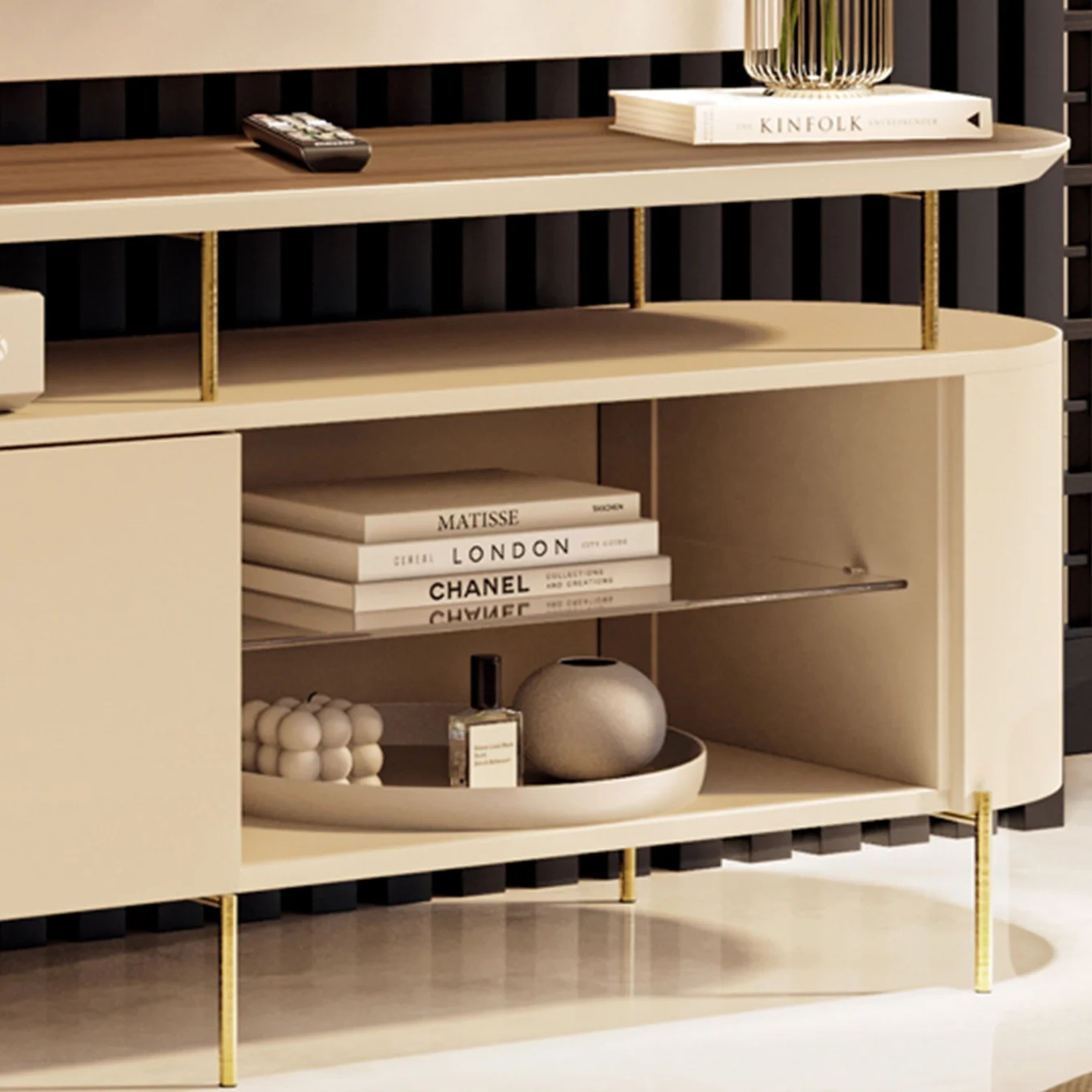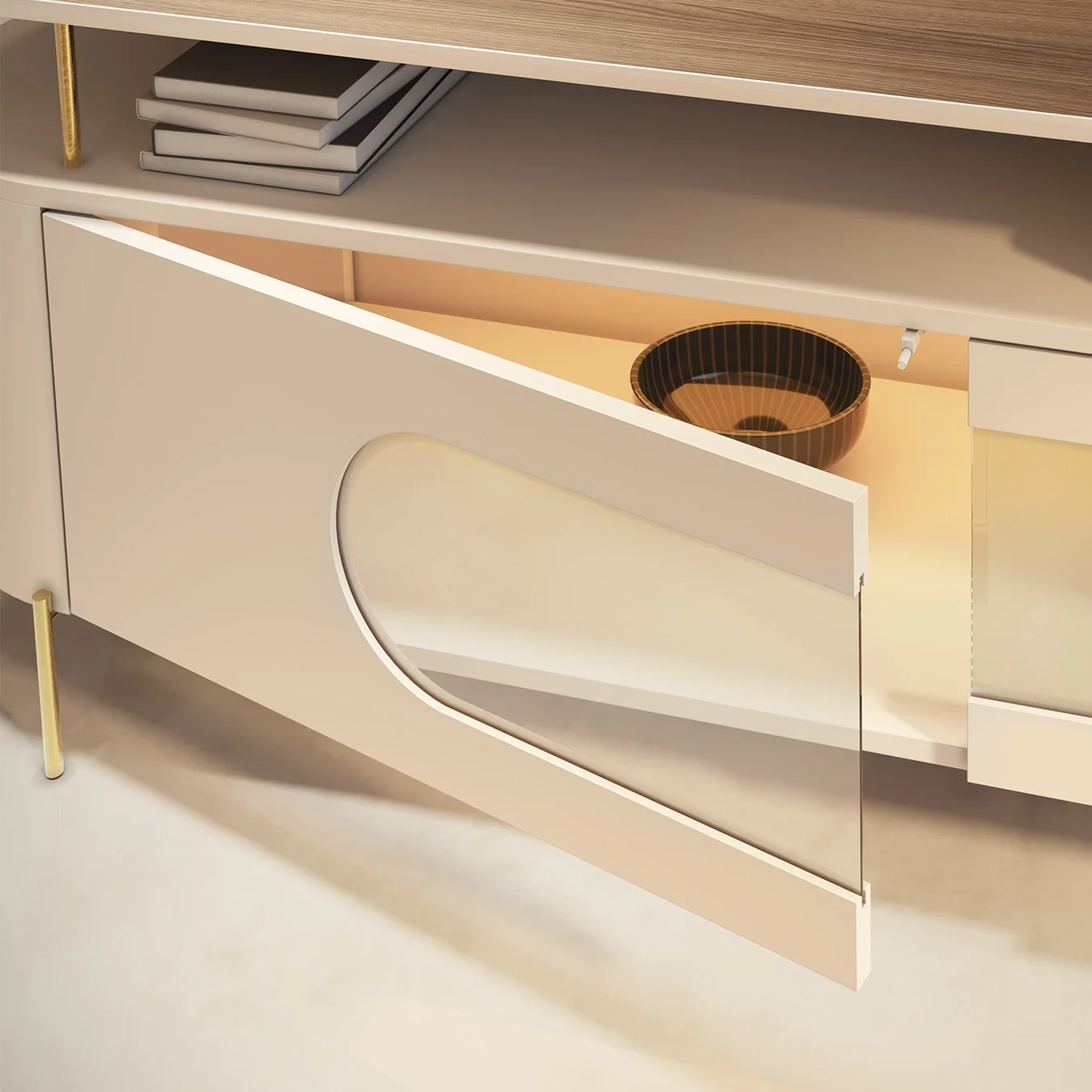 Projetada para suportar televisores de até 85 polegadas, a Bancada Para TV conta com cantos arredondados e portas com vidro embutido em caneleta, conferindo um visual moderno e elegante.