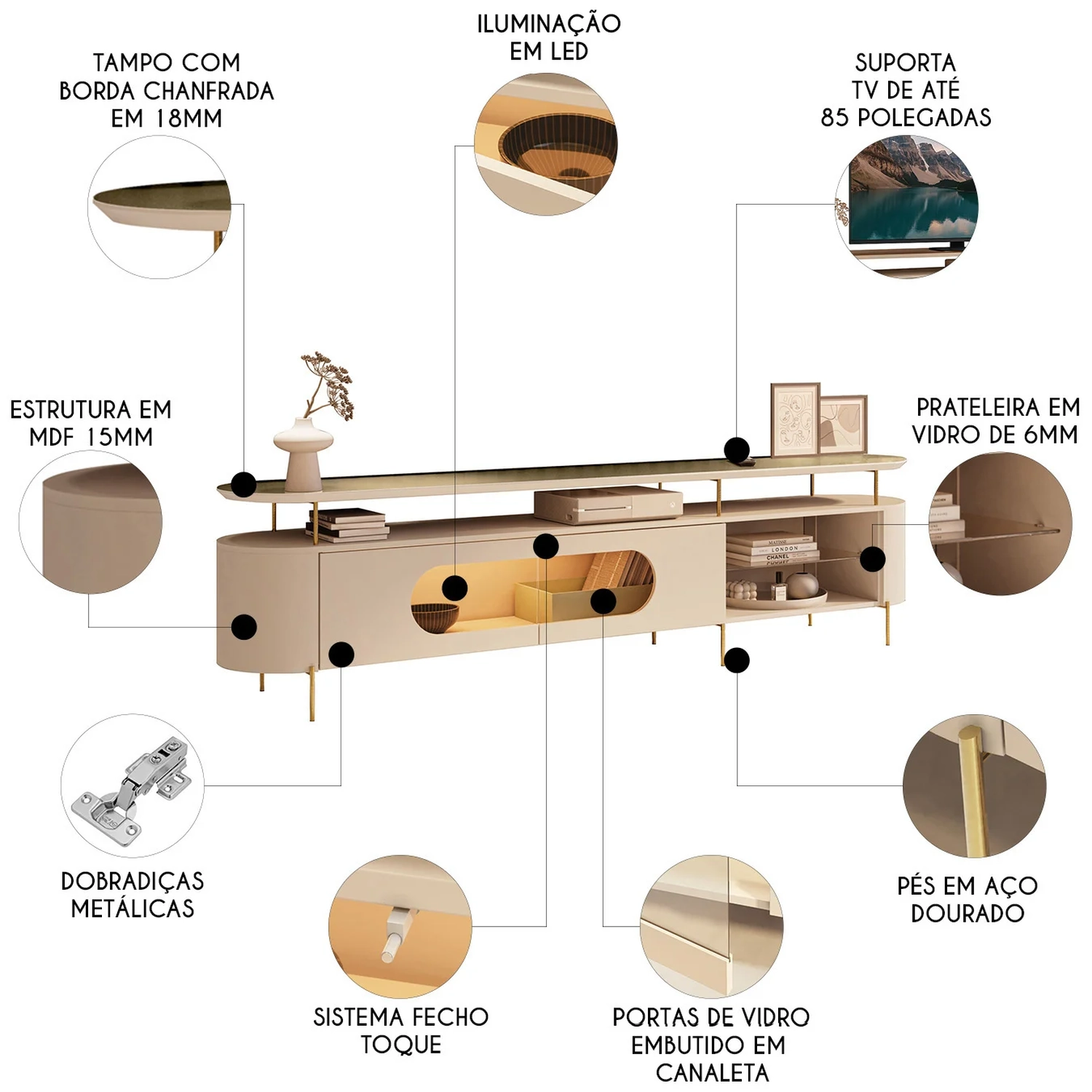Projetada para suportar televisores de até 85 polegadas, a Bancada Para TV conta com cantos arredondados e portas com vidro embutido em caneleta, conferindo um visual moderno e elegante.