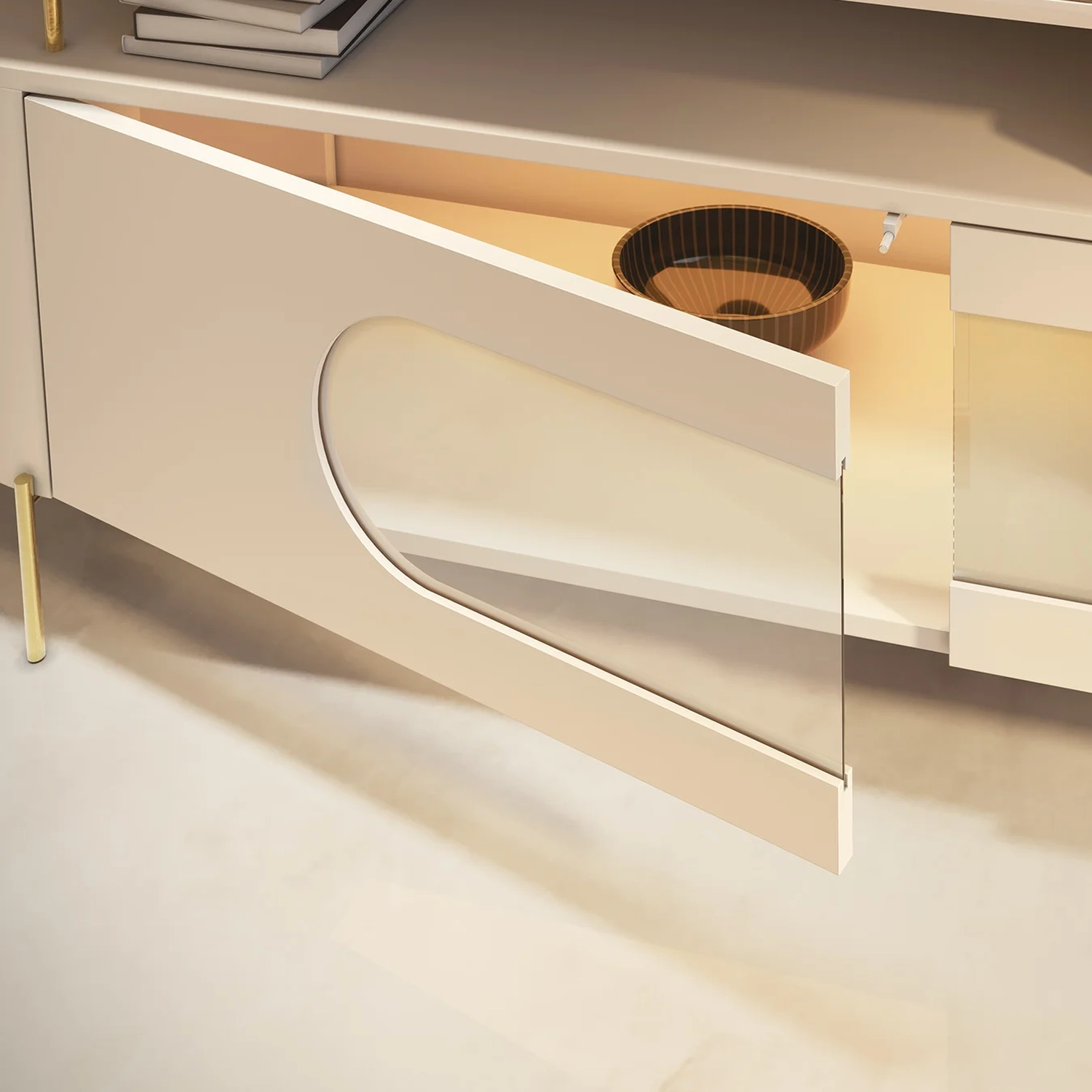 O sistema fecho toque proporciona praticidade no dia a dia, enquanto a iluminação em LED e a prateleira de vidro de 6mm valorizam objetos decorativos com charme e leveza.