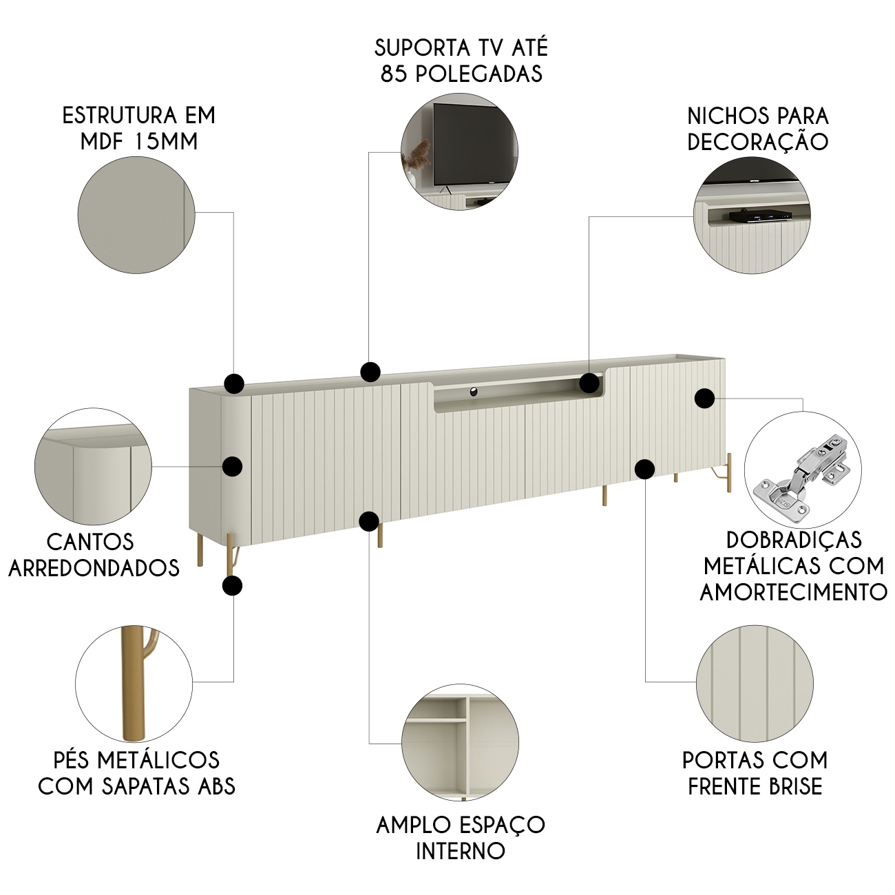 Rack TV 85 Pol 260cm 4 Portas Brise Blen Luna/Dourado I06 - Mpozenato
