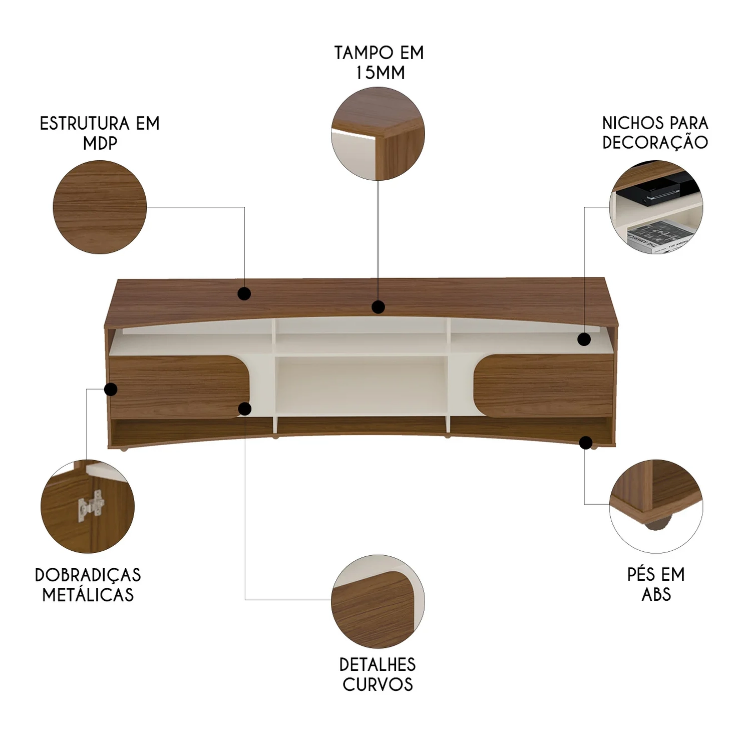 Este Rack Para Sala se destaca pelas linhas curvas, que reforçam um visual moderno e elegante. Sua estrutura firme garante resistência, ideal para compor uma Sala de Estar funcional e estilosa.