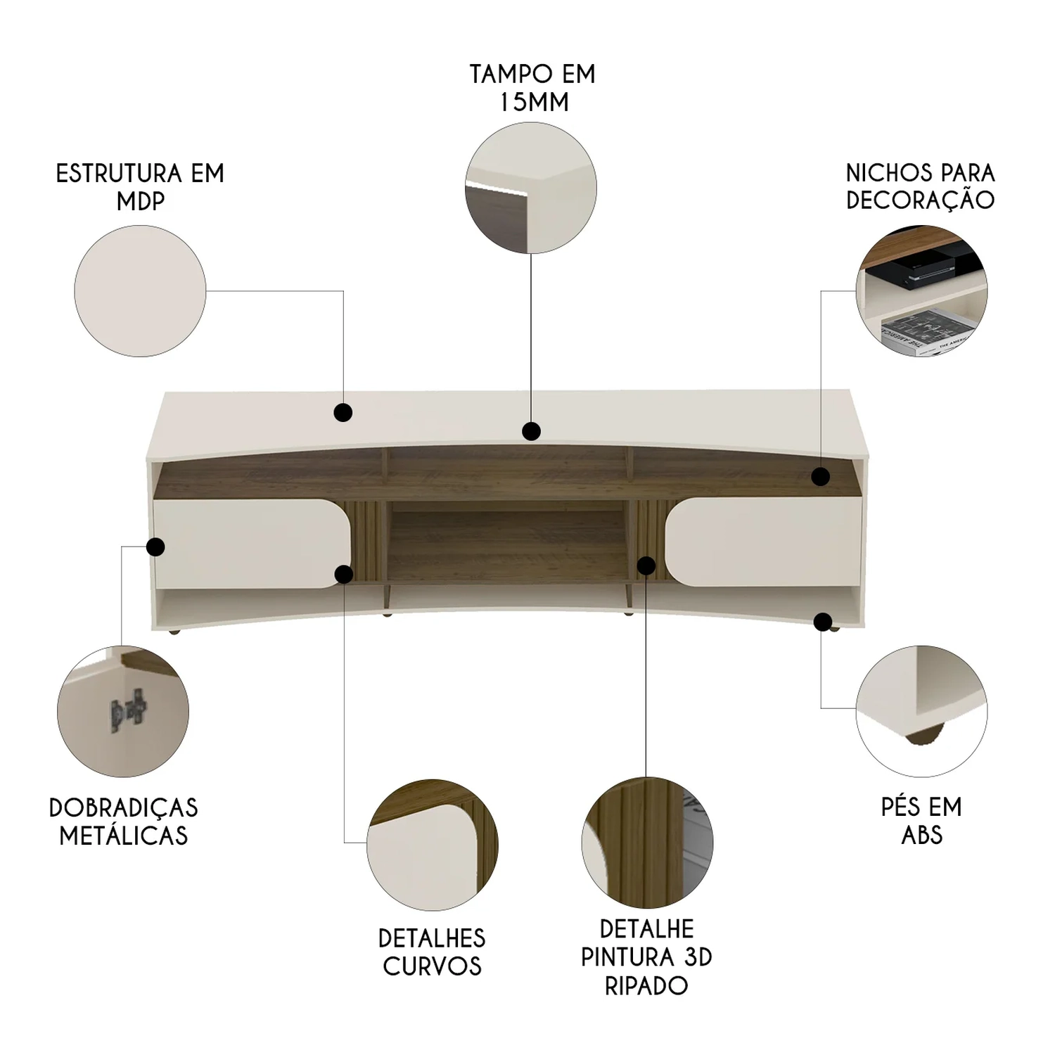 Este Rack Para Sala se destaca pelas linhas curvas, que reforçam um visual moderno e elegante. Sua estrutura firme garante resistência, ideal para compor uma Sala de Estar funcional e estilosa.