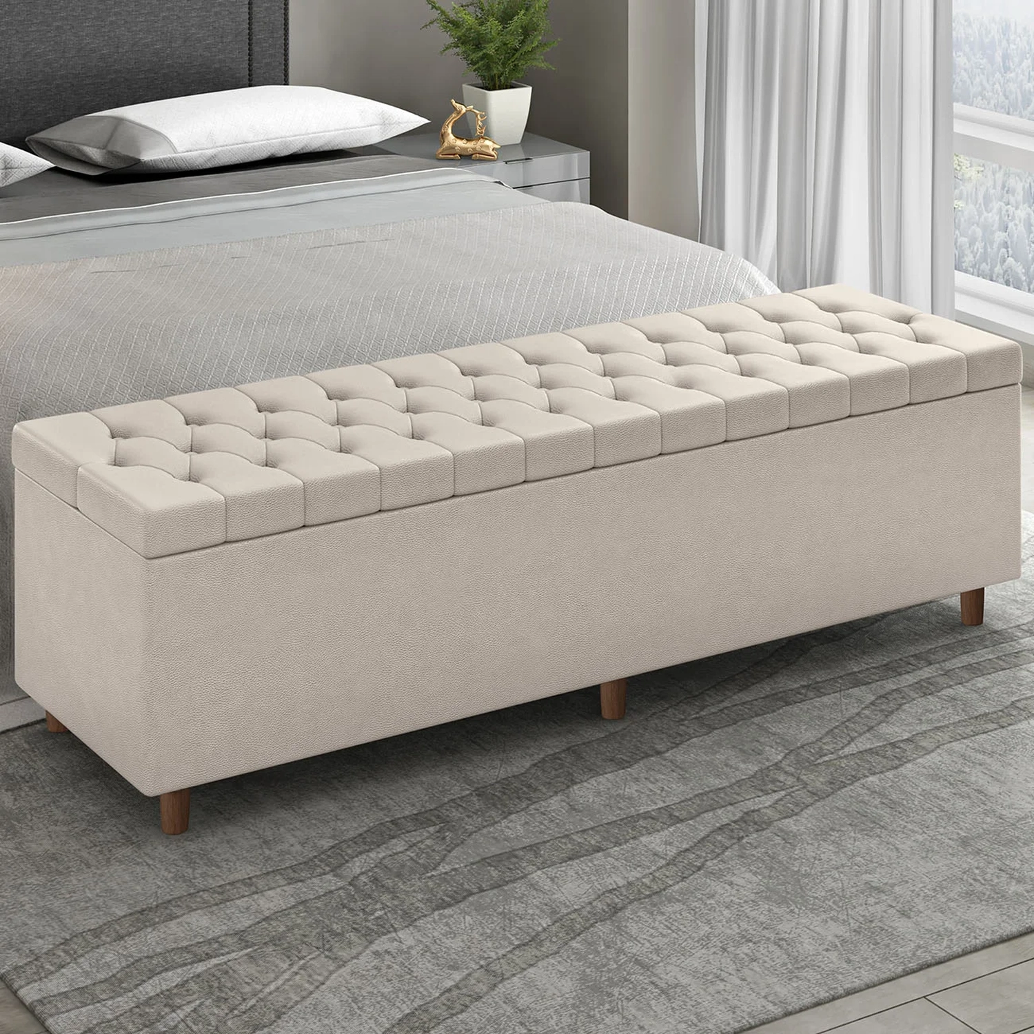 O assento acolchoado oferece conforto na medida certa, seja para sentar ou apoiar os pés, enquanto os pés em madeira trazem um toque natural que deixa o Quarto mais aconchegante.
