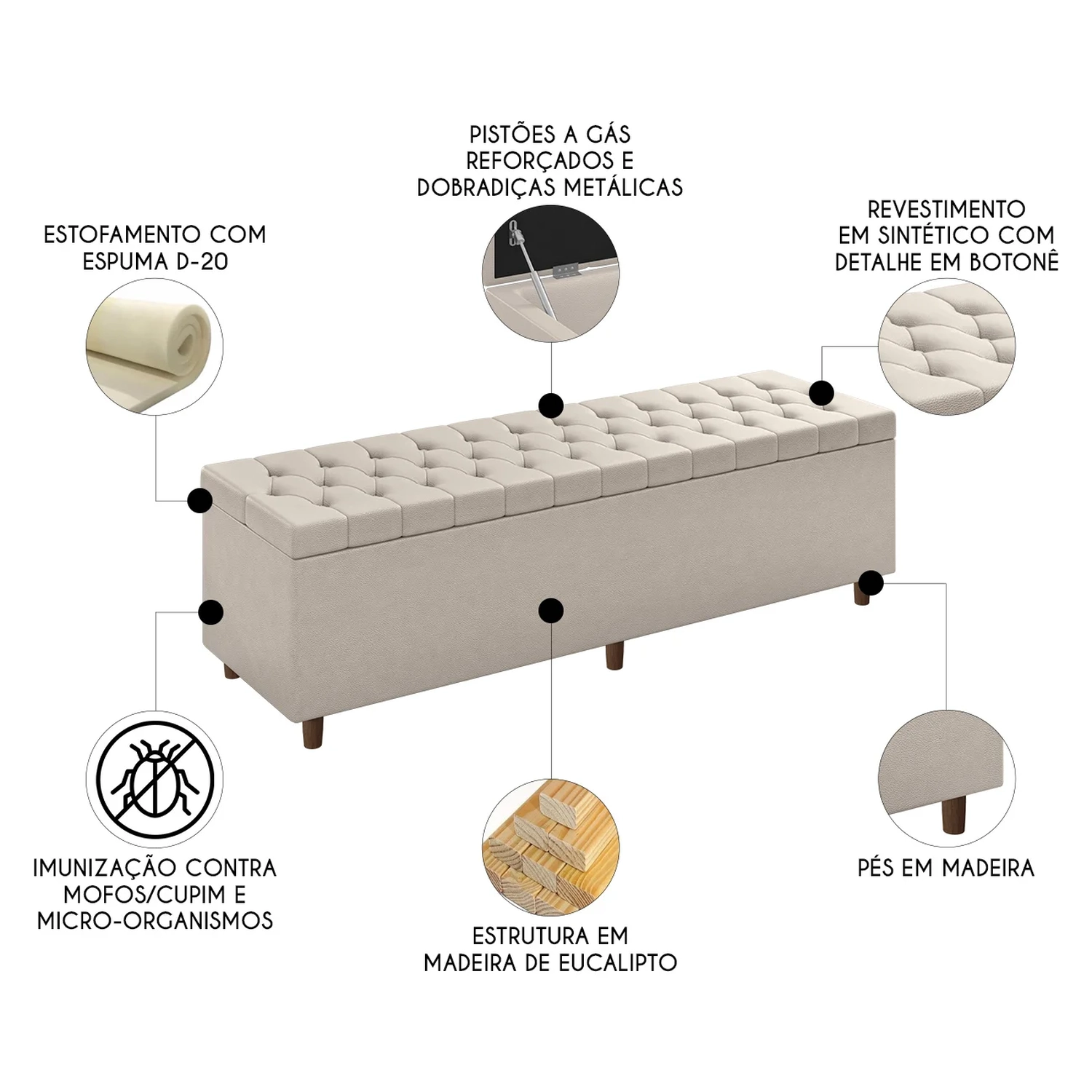 Equipado com pistões a gás e ferragens metálicas, o Recamier Baú é super fácil de abrir e fechar, garantindo praticidade e segurança no dia a dia.