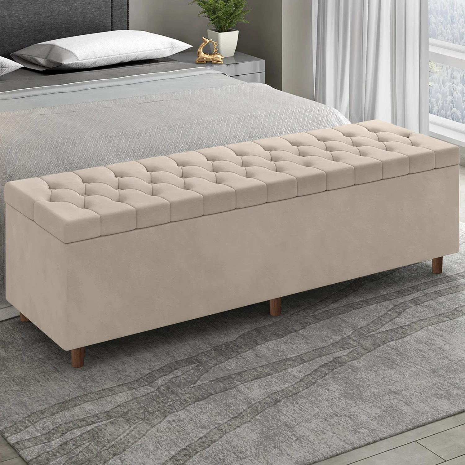 O assento acolchoado garante conforto tanto para sentar quanto para apoiar os pés, e os pés em madeira dão aquele toque natural que deixa seu Quarto ainda mais acolhedor.
