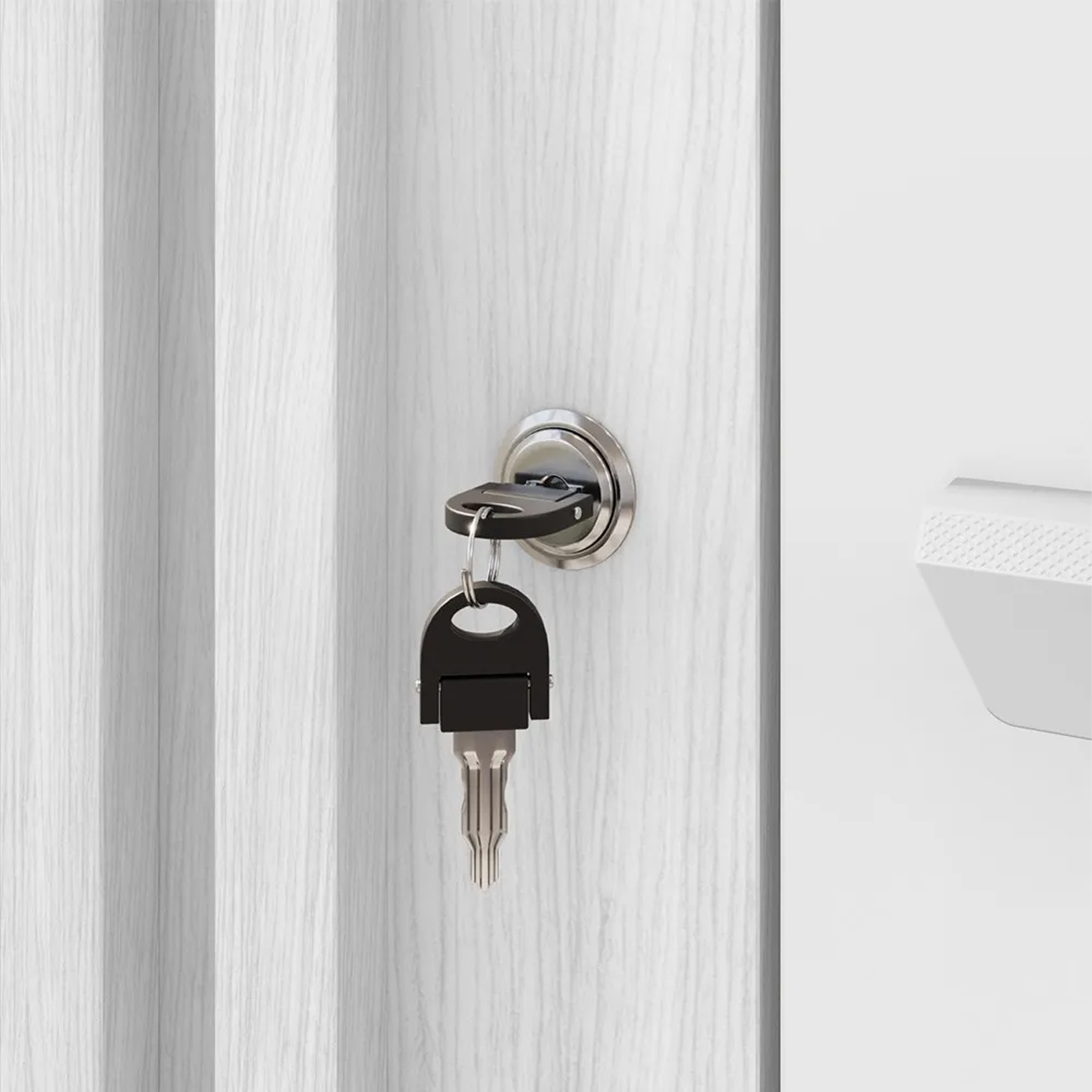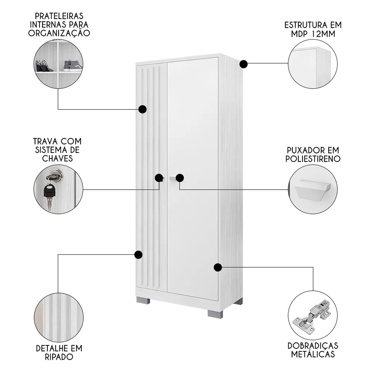 - Porta lateral com detalhe ripado e chave para mais segurança.