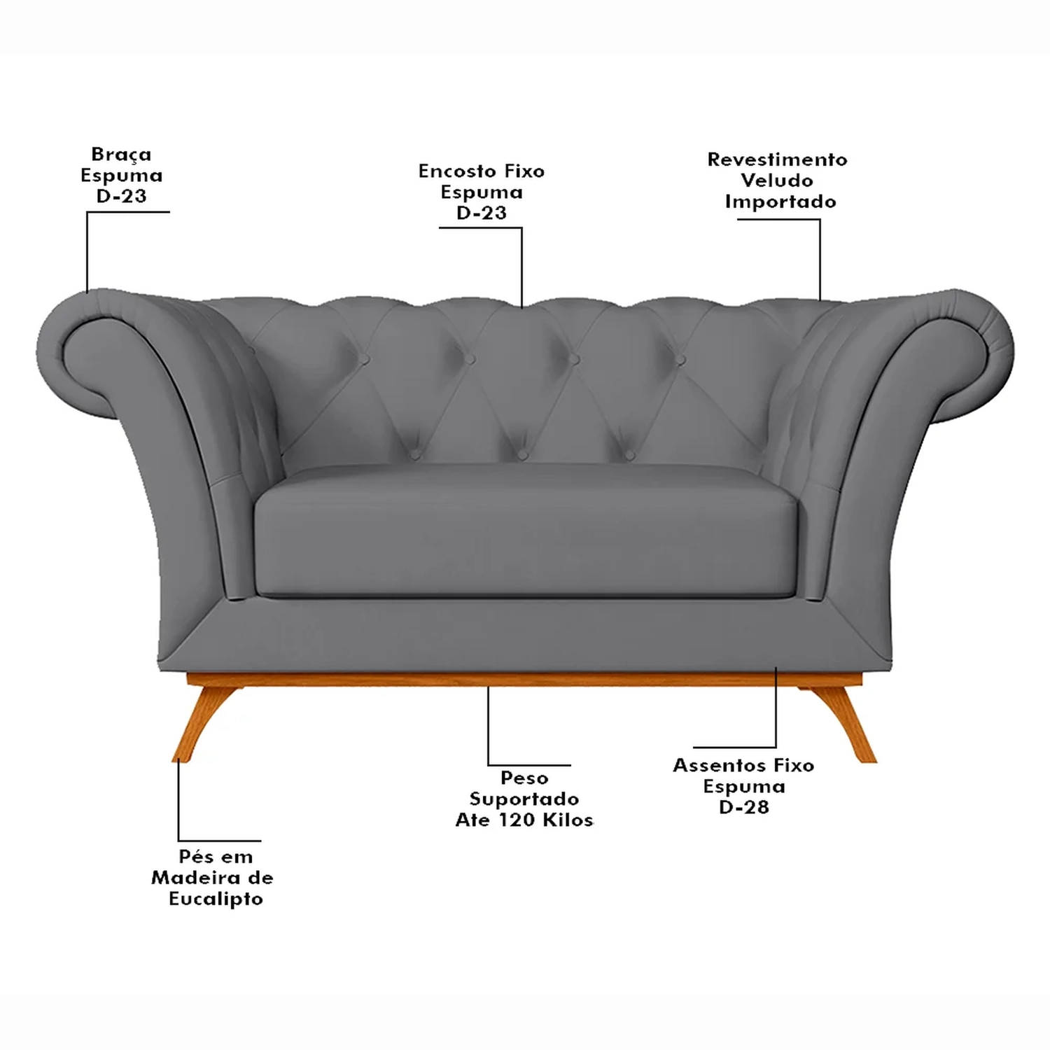 Sofá 150cm 2 Lugares Base Madeira Império D-317 Veludo Cinza - Domi 81568