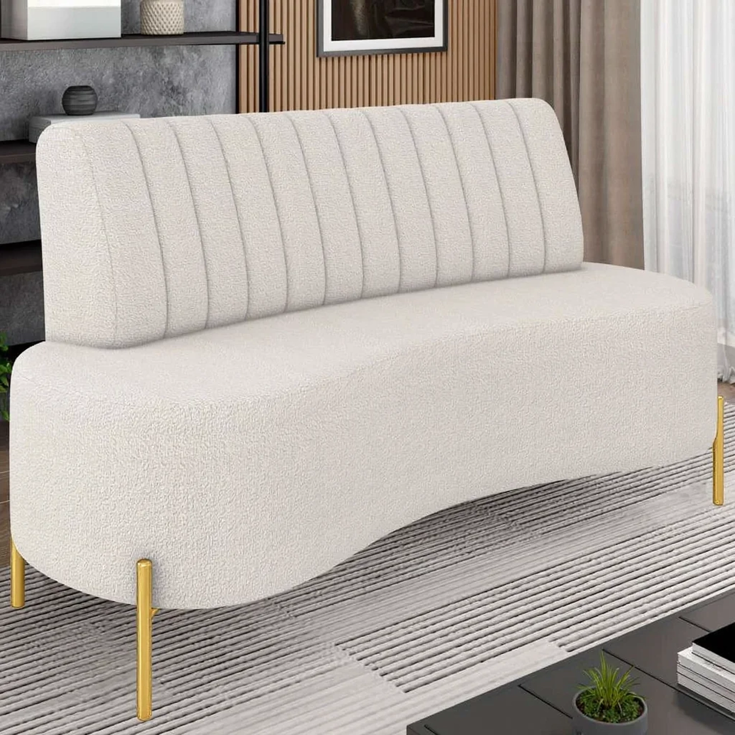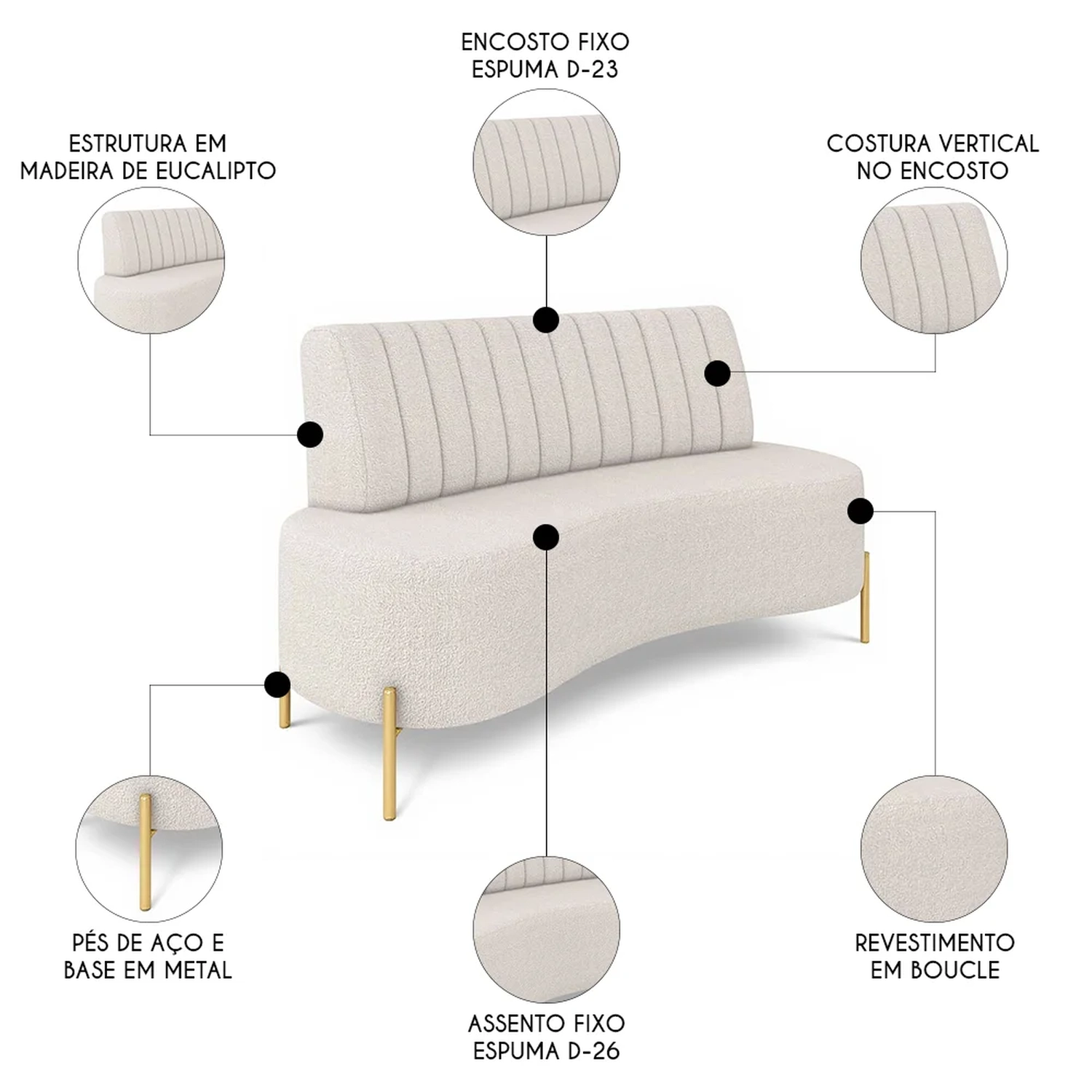Sofá 2 Lugares 135cm Pés Aço Dourado Tamar Boucle Bege Z08 - Mpozenato