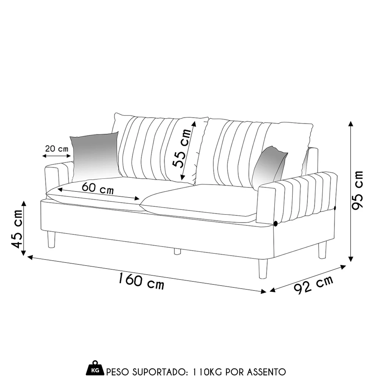 Peso Suportado: 110 Kg por assento.