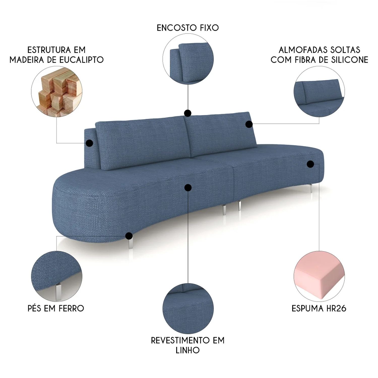 Versátil, esse Sofá se adapta a diversos estilos de decoração. Os pés em ferro reforçam a estabilidade da peça e complementam o design com um toque natural e acolhedor.