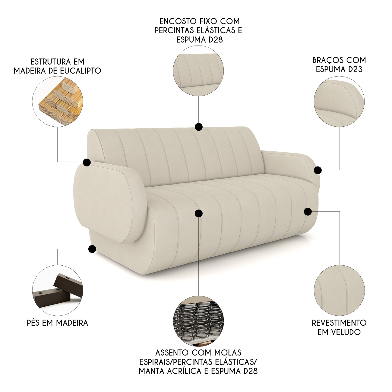 O assento fixo com molas espirais oferece sustentação uniforme, além de assento e encosto ser com espuma D-28, proporcionando conforto e suavidade. As Percintas elásticas distribuem o peso de forma equilibrada e confortável.