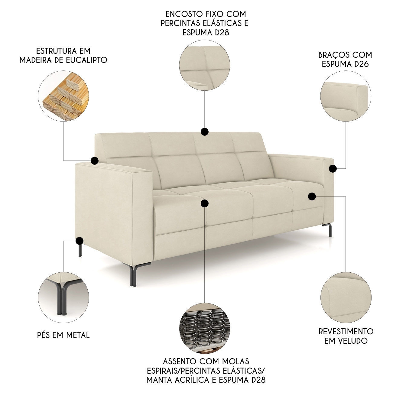 A estrutura em madeira de eucalipto reflorestada garante durabilidade e firmeza. O encosto e assento fixos, ambos em espuma D-28 com molas espirais e manta acrílica oferece suporte ao Sofá 2 Lugares mantendo o formato original por mais tempo.