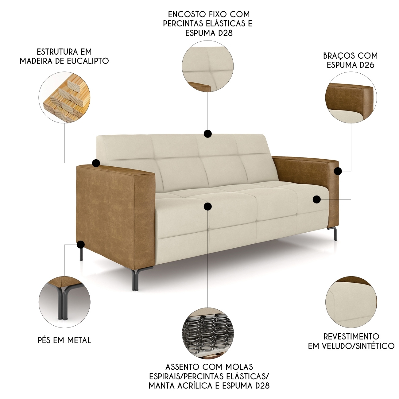 Os pés em metal na cor preto completam a estrutura com um toque contemporâneo. O conjunto exibe harmonia entre materiais, conforto e estilo, resultando em um Sofá de aparência sólida e acabamento refinado.