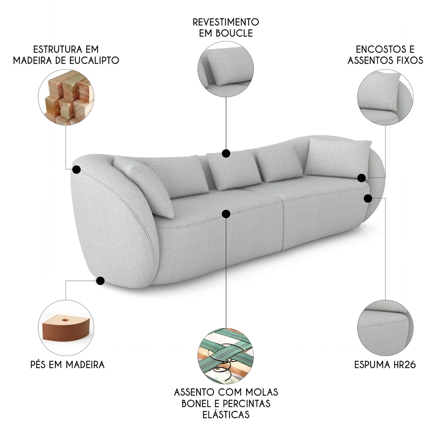 O assento do Sofá é composto por espuma HR26, molas bonel e percintas elásticas, oferecendo um toque macio com suporte reforçado para o uso diário.