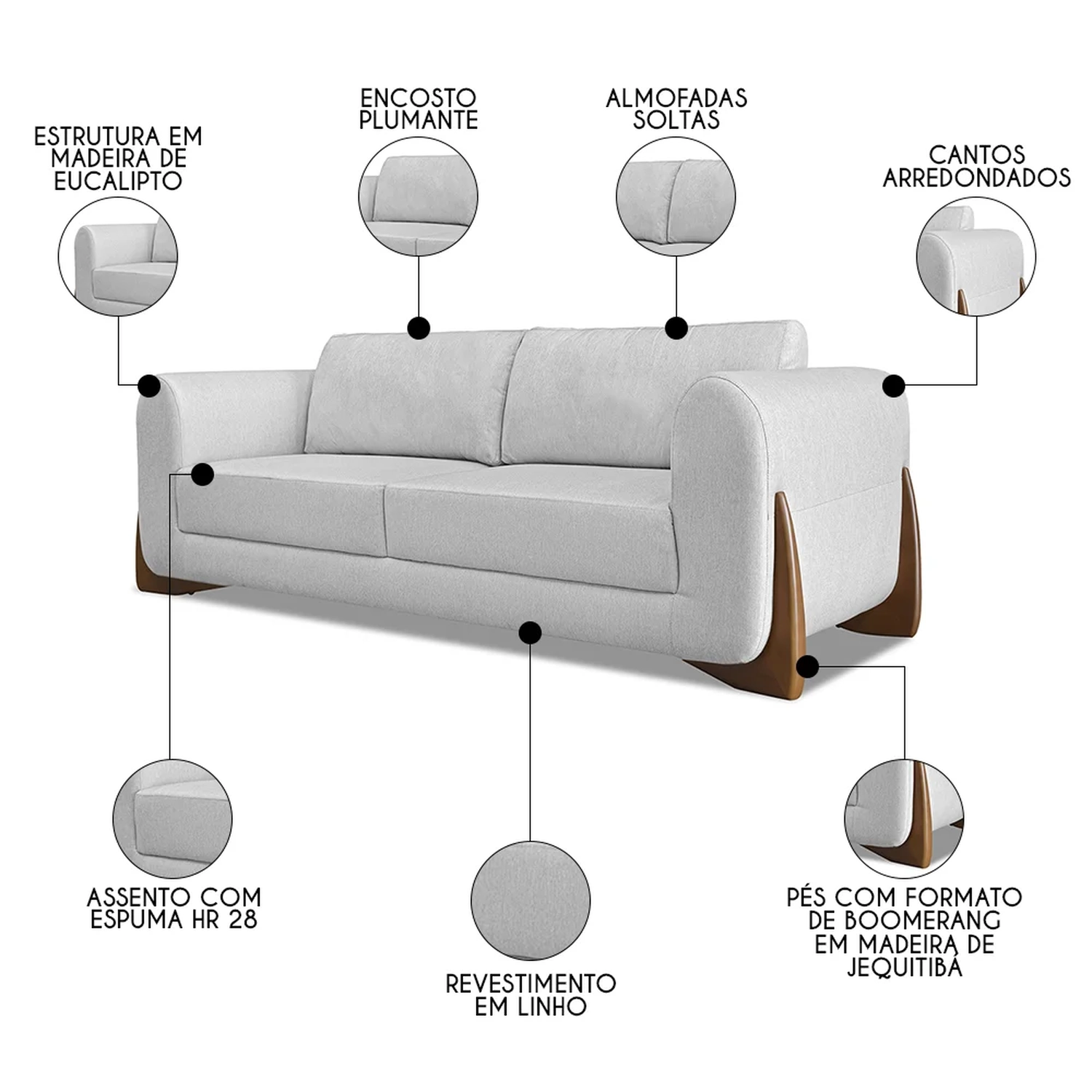 O Sofá Living é revestido em linho de alta qualidade, proporcionando uma textura agradável ao toque. Os pés do sofá são um destaque à parte, com acabamento em madeira de jequitibá, conhecida por sua durabilidade e beleza natural. A estrutura é feita de madeira maciça de eucalipto, garantindo resistência e durabilidade. O assento é em espuma HR28, complementada por plumante em silicone, oferecendo um equilíbrio perfeito entre suporte e maciez. O design dos pés em formato boomerang, com 8 cm de altura na cor mel, adiciona um toque retro-moderno à peça. Este Sofá 2 Lugares não é apenas um móvel, mas uma peça de decoração que reflete sofisticação e um padrão de acabamento de alto nível para a sua Sala de Estar.