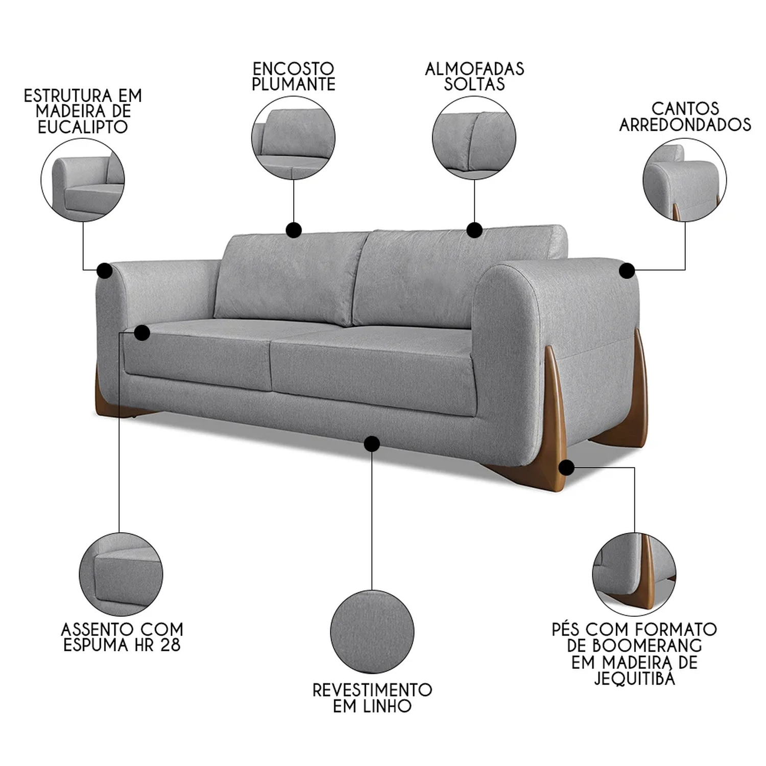 O Sofá Living é revestido em linho de alta qualidade, proporcionando uma textura agradável ao toque. Os pés do sofá são um destaque à parte, com acabamento em madeira de jequitibá, conhecida por sua durabilidade e beleza natural. A estrutura é feita de madeira maciça de eucalipto, garantindo resistência e durabilidade. O assento é em espuma HR28, complementada por plumante em silicone, oferecendo um equilíbrio perfeito entre suporte e maciez. O design dos pés em formato boomerang, com 8 cm de altura na cor mel, adiciona um toque retro-moderno à peça. Este Sofá 2 Lugares não é apenas um móvel, mas uma peça de decoração que reflete sofisticação e um padrão de acabamento de alto nível para a sua Sala de Estar.