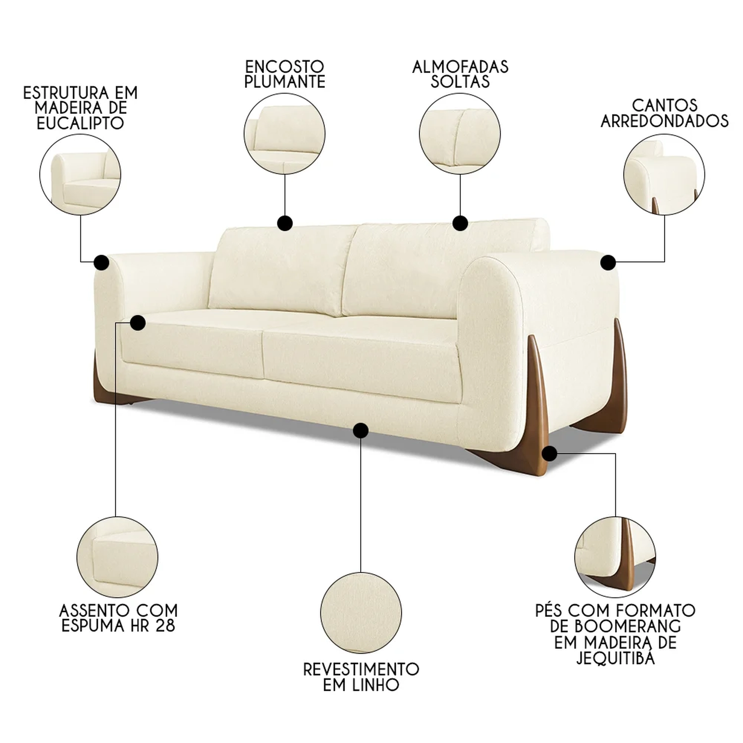 O Sofá Living é revestido em linho de alta qualidade, proporcionando uma textura agradável ao toque. Os pés do sofá são um destaque à parte, com acabamento em madeira de jequitibá, conhecida por sua durabilidade e beleza natural. A estrutura é feita de madeira maciça de eucalipto, garantindo resistência e durabilidade. O assento é em espuma HR28, complementada por plumante em silicone, oferecendo um equilíbrio perfeito entre suporte e maciez. O design dos pés em formato boomerang, com 8 cm de altura na cor mel, adiciona um toque retro-moderno à peça. Este Sofá 2 Lugares não é apenas um móvel, mas uma peça de decoração que reflete sofisticação e um padrão de acabamento de alto nível para a sua Sala de Estar.