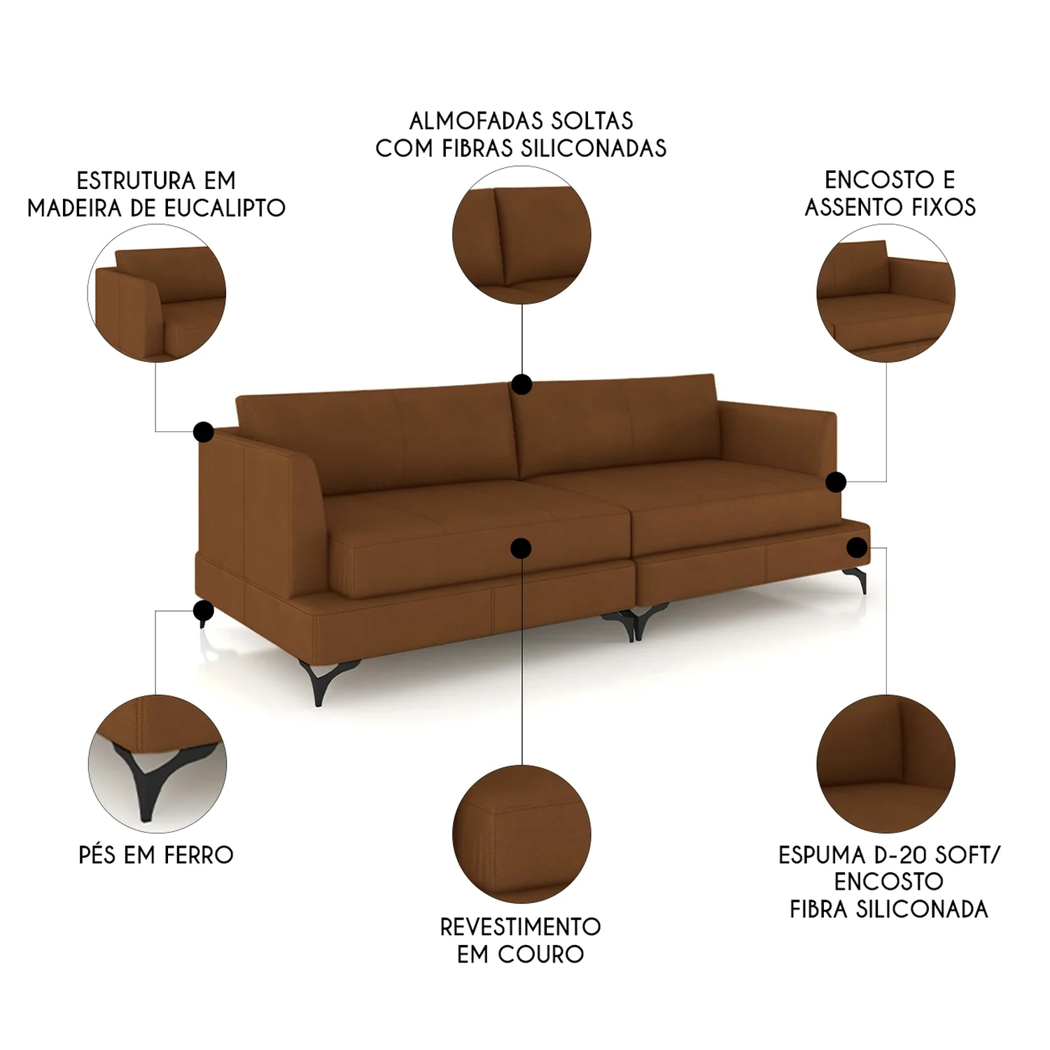 Feito com madeira de eucalipto, o Sofá de Couro oferece uma base robusta e alta durabilidade, perfeito para quem busca um sofá que acompanhe o ritmo do dia a dia.