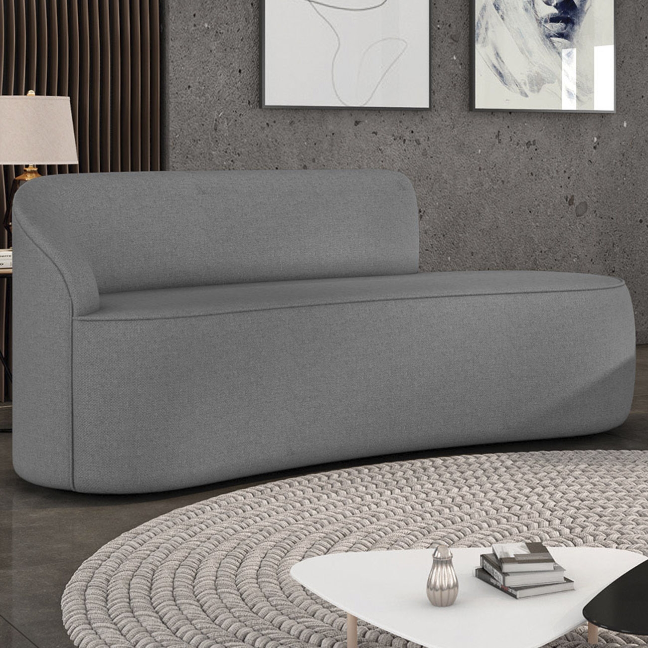 Com formato fluido e curvo, este modelo traz leveza e modernidade ao ambiente, criando um espaço acolhedor e visualmente harmônico. Sua estrutura robusta em madeira de eucalipto com MDF reforça a sensação de segurança e durabilidade no uso diário.