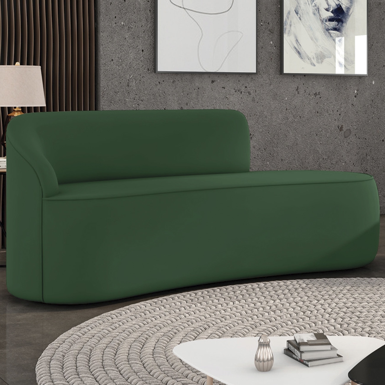 Com formato fluido e curvo, este modelo traz leveza e modernidade ao ambiente, criando um espaço acolhedor e visualmente harmônico. Sua estrutura robusta em madeira de eucalipto com MDF reforça a sensação de segurança e durabilidade no uso diário.