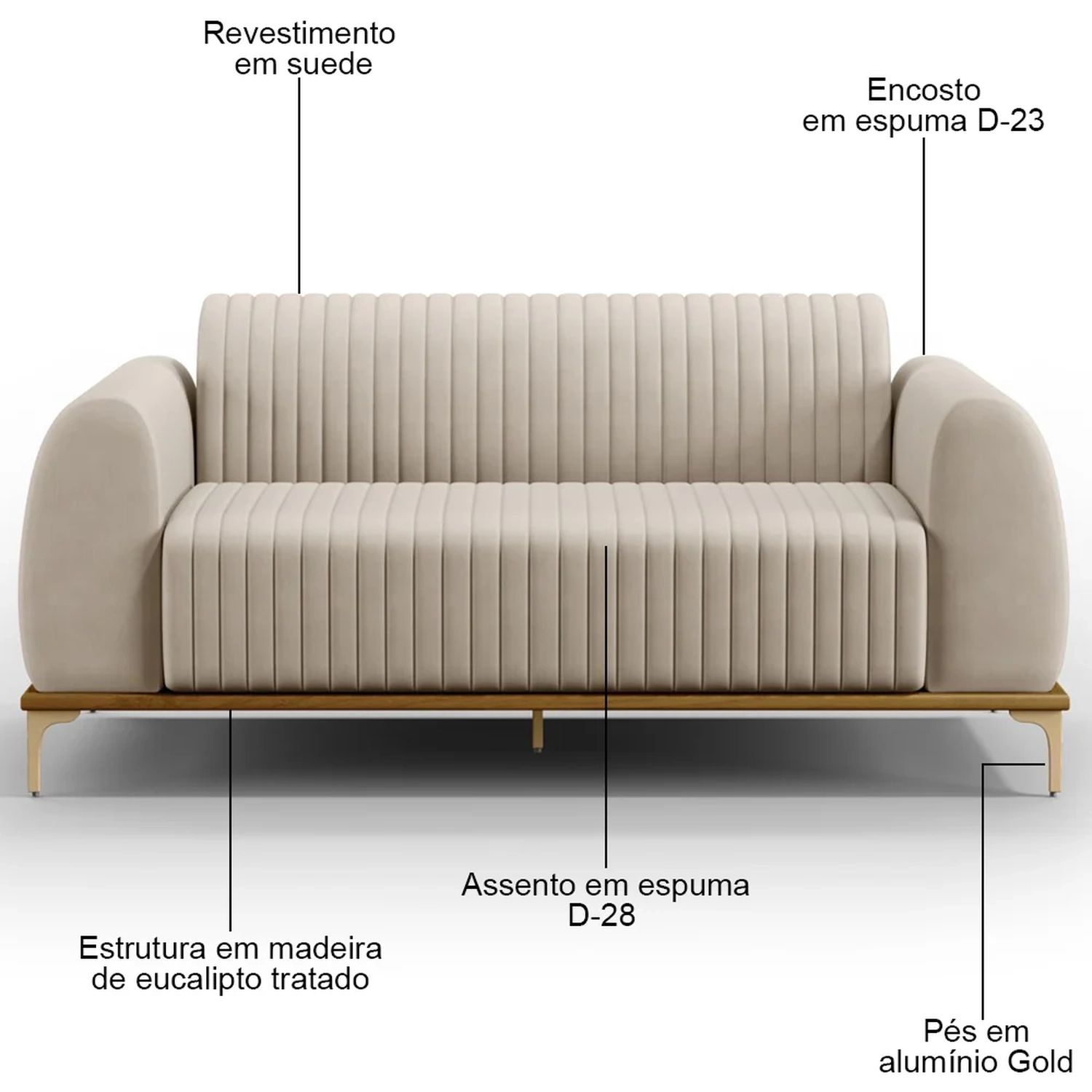 Um sofá para sala espaçoso e confortável é a peça principal do cômodo. Afinal, é onde podemos descansar assistindo uma boa série, filme favorito, ler, passar um tempo com família e amigos ou simplesmente ter o descanso merecido. Não é? Pois bem, por isso apresentamos o Sofá Molino 210cm! A princípio, ele possui base em madeira de eucalipto envernizada com pés em alumínio, estrutura em misto de madeira com MDF e OSB e a parte estofada é em espuma D-23 no encosto e espuma D-28 no assento. Além desses detalhes, também é revestido em suede, conferindo maciez ao toque e uma dose extra de durabilidade e resistência.