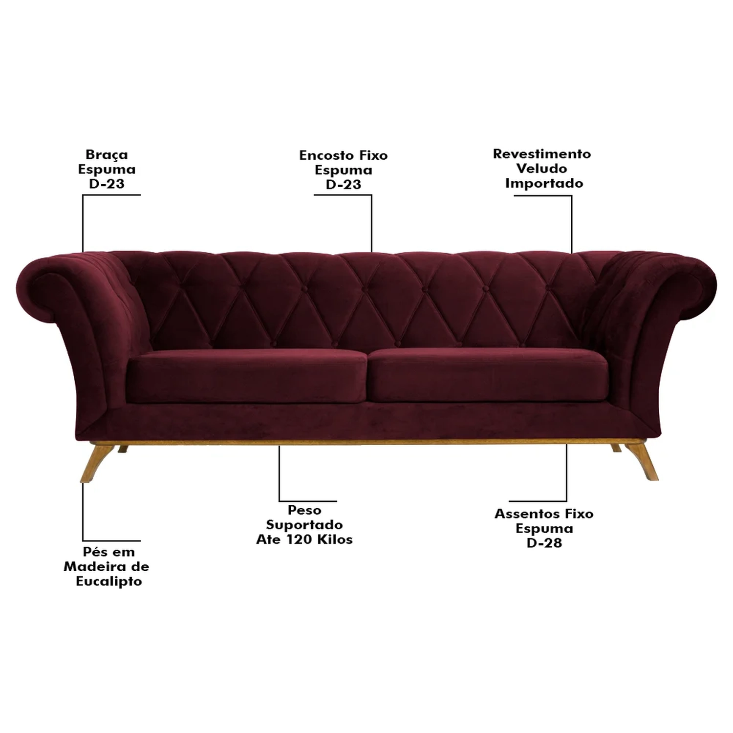 Sofá 230cm 3 Lugares Base Madeira Império C-278 Veludo Marsala - Domi 77973