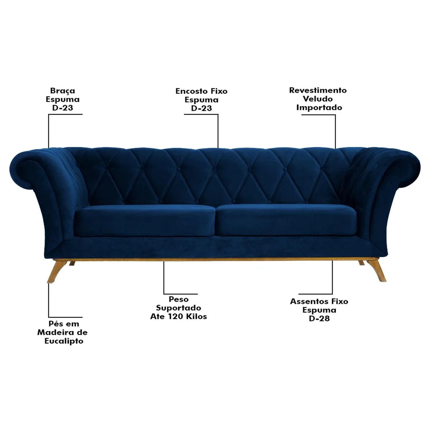 Sofá 230cm 3 Lugares Base Madeira Império C-304 Veludo Azul Marinho - Domi 77974