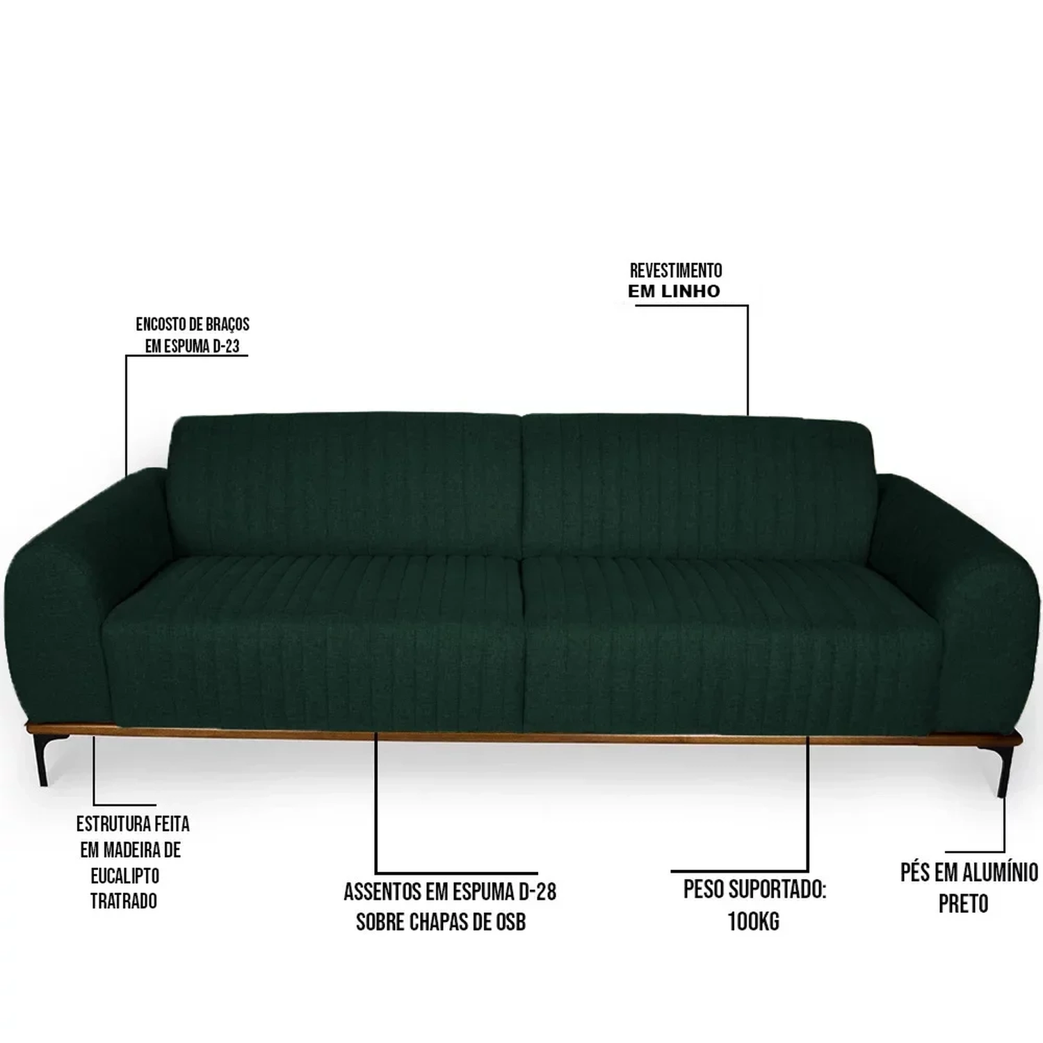Sofá 230cm 3 Lugares Pés Preto Molino C-117 Linho Verde Musgo - Domi 77569