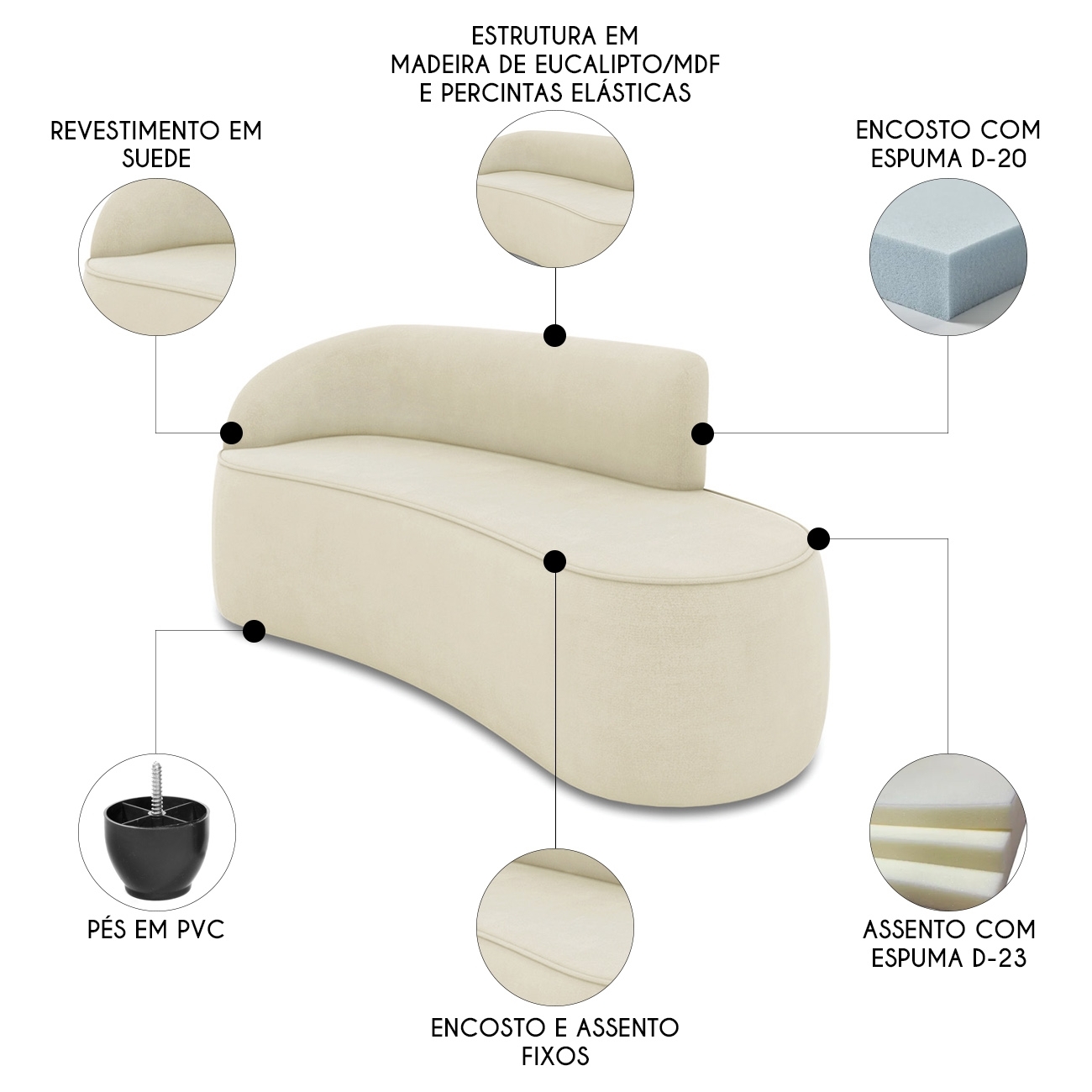 Com formato fluido e curvo, o modelo de três lugares com 180cm oferece design marcante e proporções ideais para compor ambientes com estilo. Sua estrutura robusta em madeira de eucalipto com MDF reforça a sensação de segurança e durabilidade no uso diário.