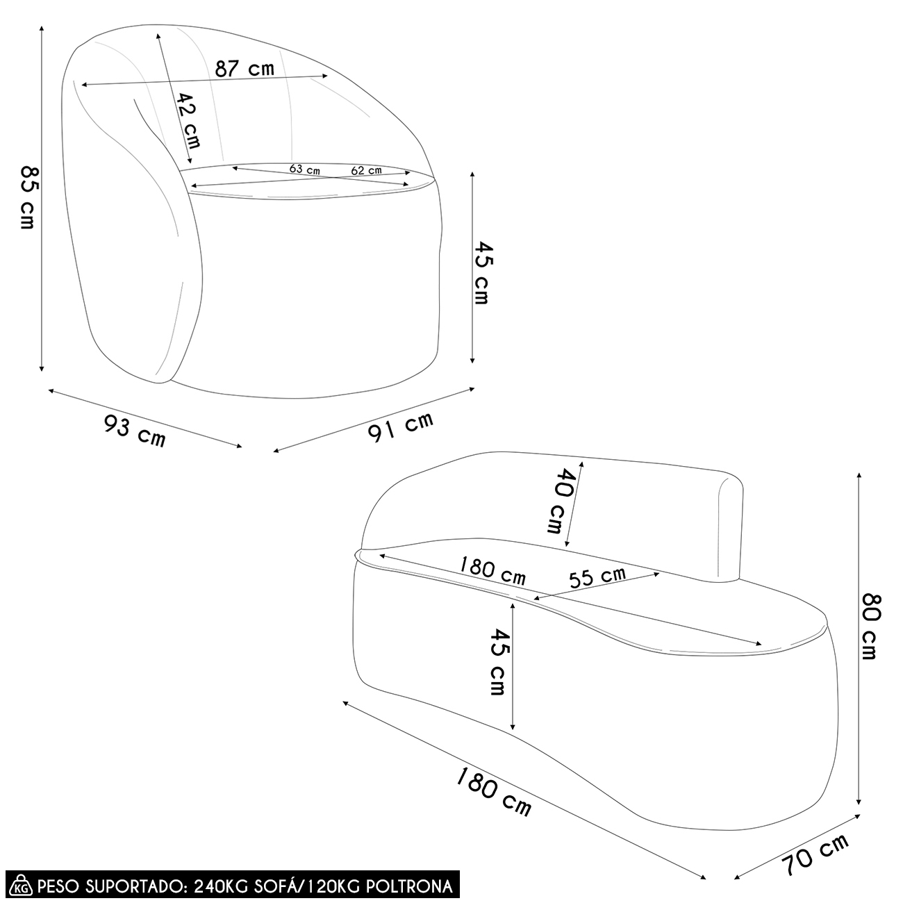 Peso Suportado Distribuído: Sofá 240Kg/Poltrona 120Kg.
