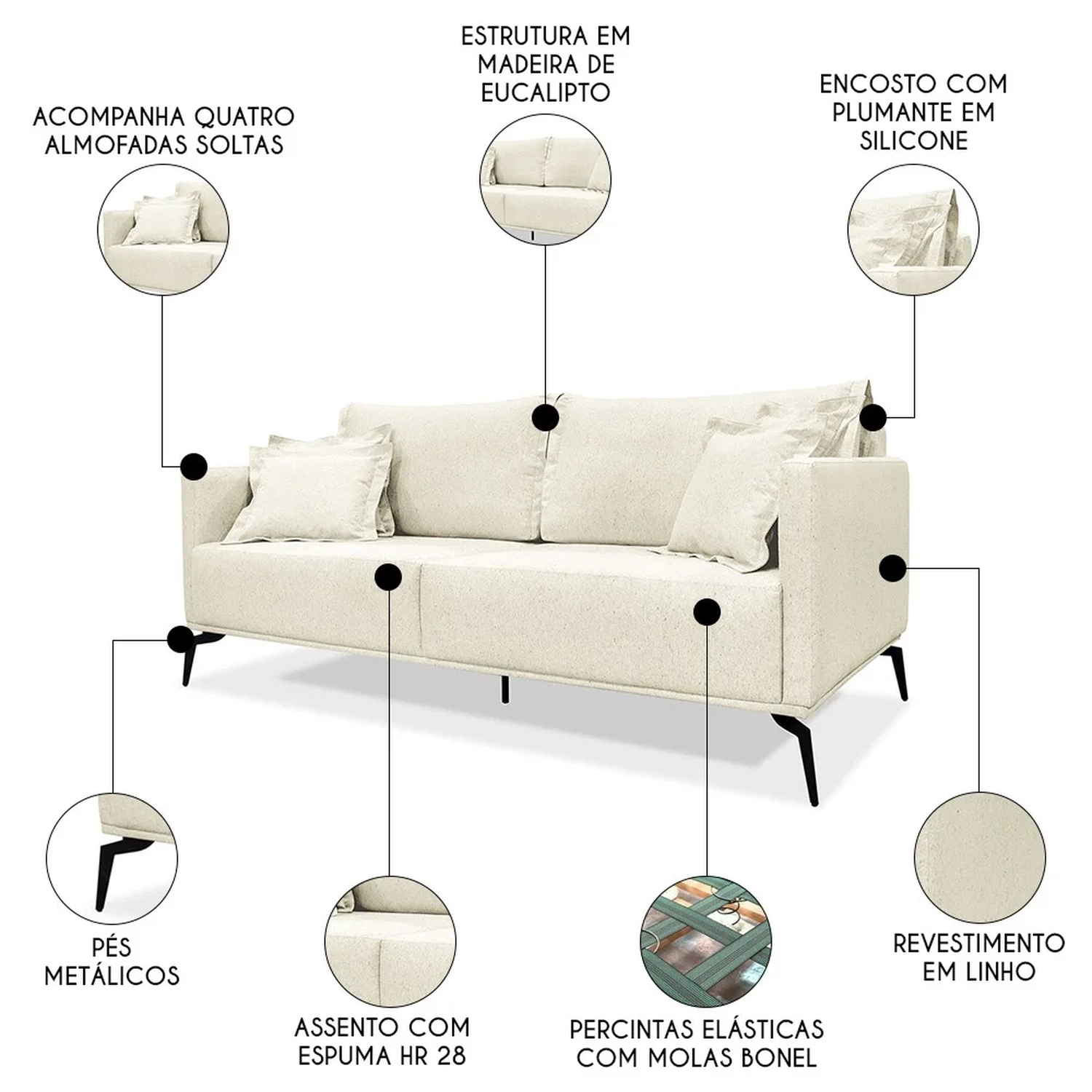 O Sofá 3 Lugares 200cm Pés de Metal Vecchia S06 Linho Natural, da Mpozenato é uma escolha excelente para quem procura conforto, qualidade e design contemporâneo.