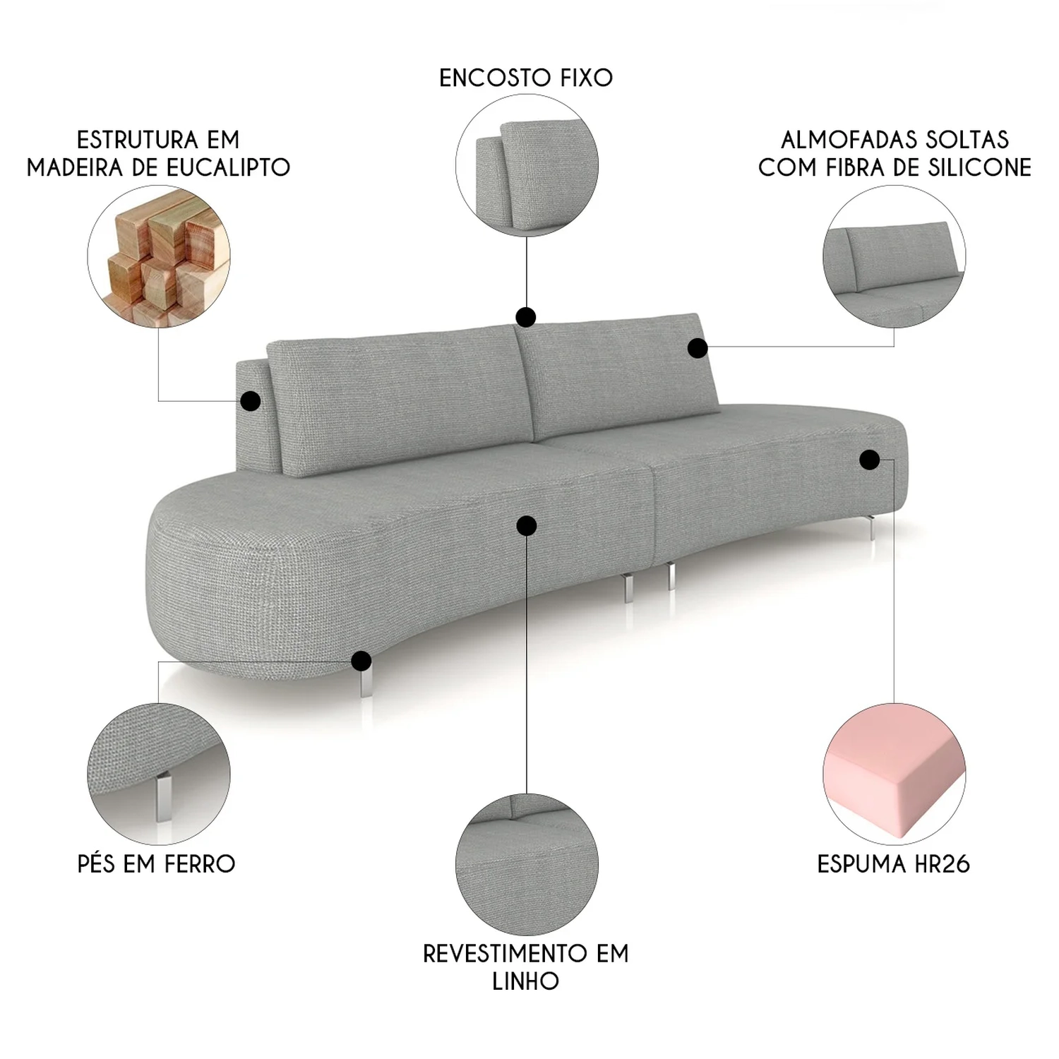 Versátil, esse Sofá se adapta a diversos estilos de decoração. Os pés em ferro reforçam a estabilidade da peça e complementam o design com um toque natural e acolhedor.