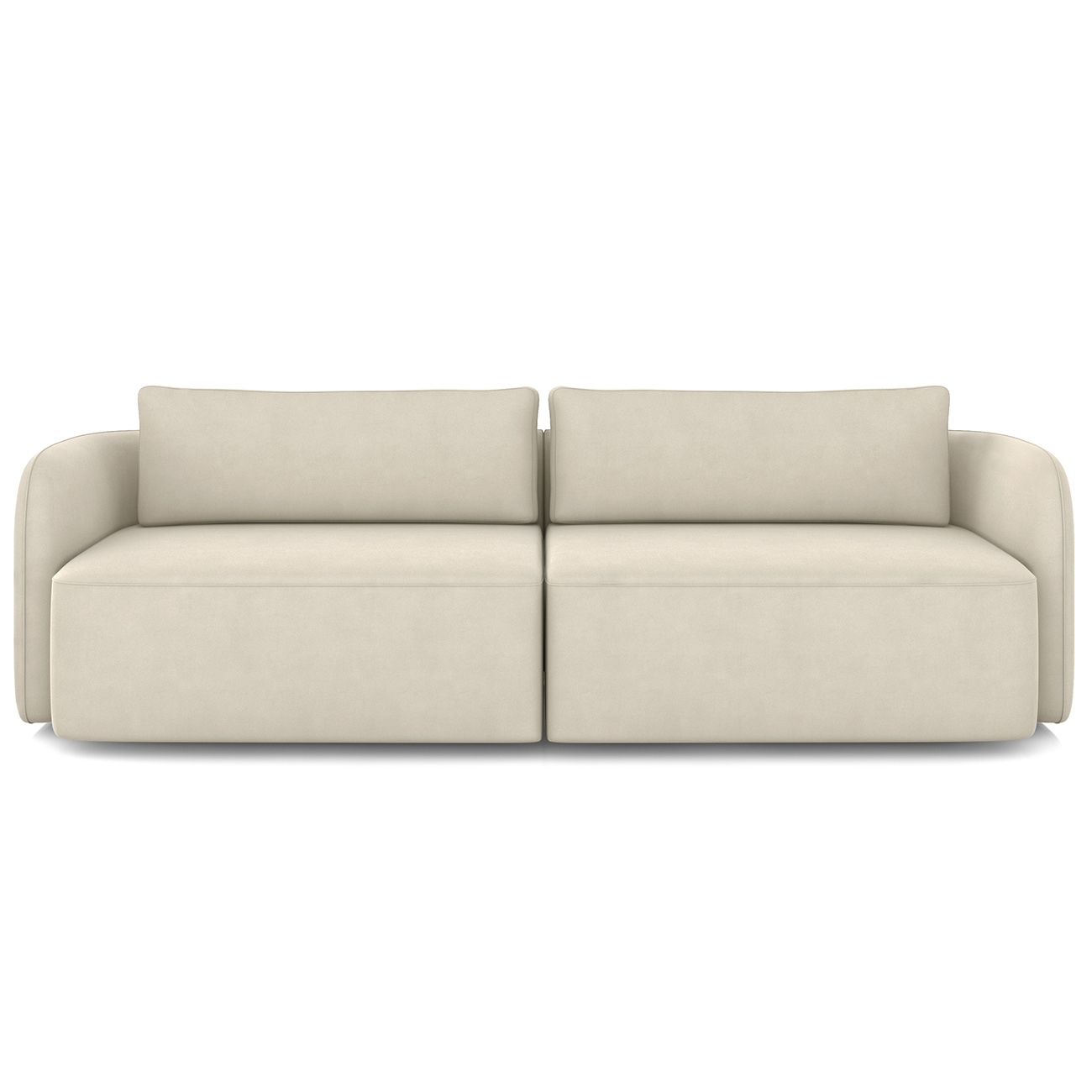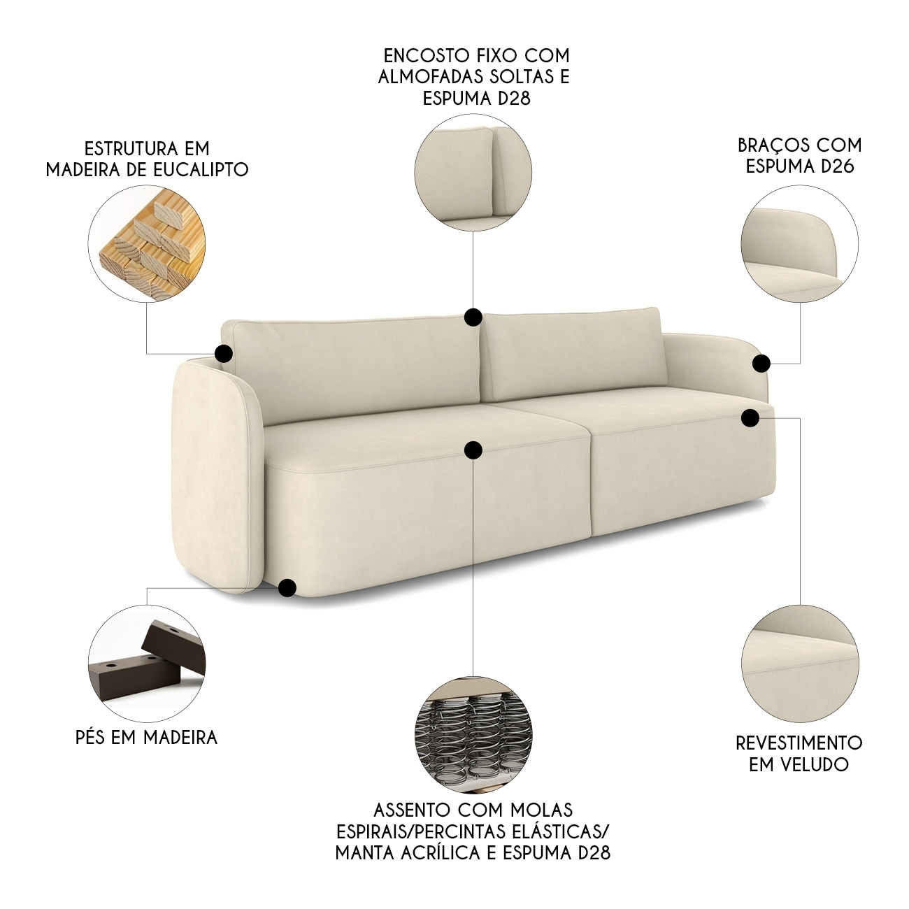 Os braços com acabamento curvo em espuma D-26 completam a estrutura robusta em madeira tratada de eucalipto reflorestada. Essa base reforça a resistência e a estabilidade, preservando o equilíbrio entre firmeza e suavidade.