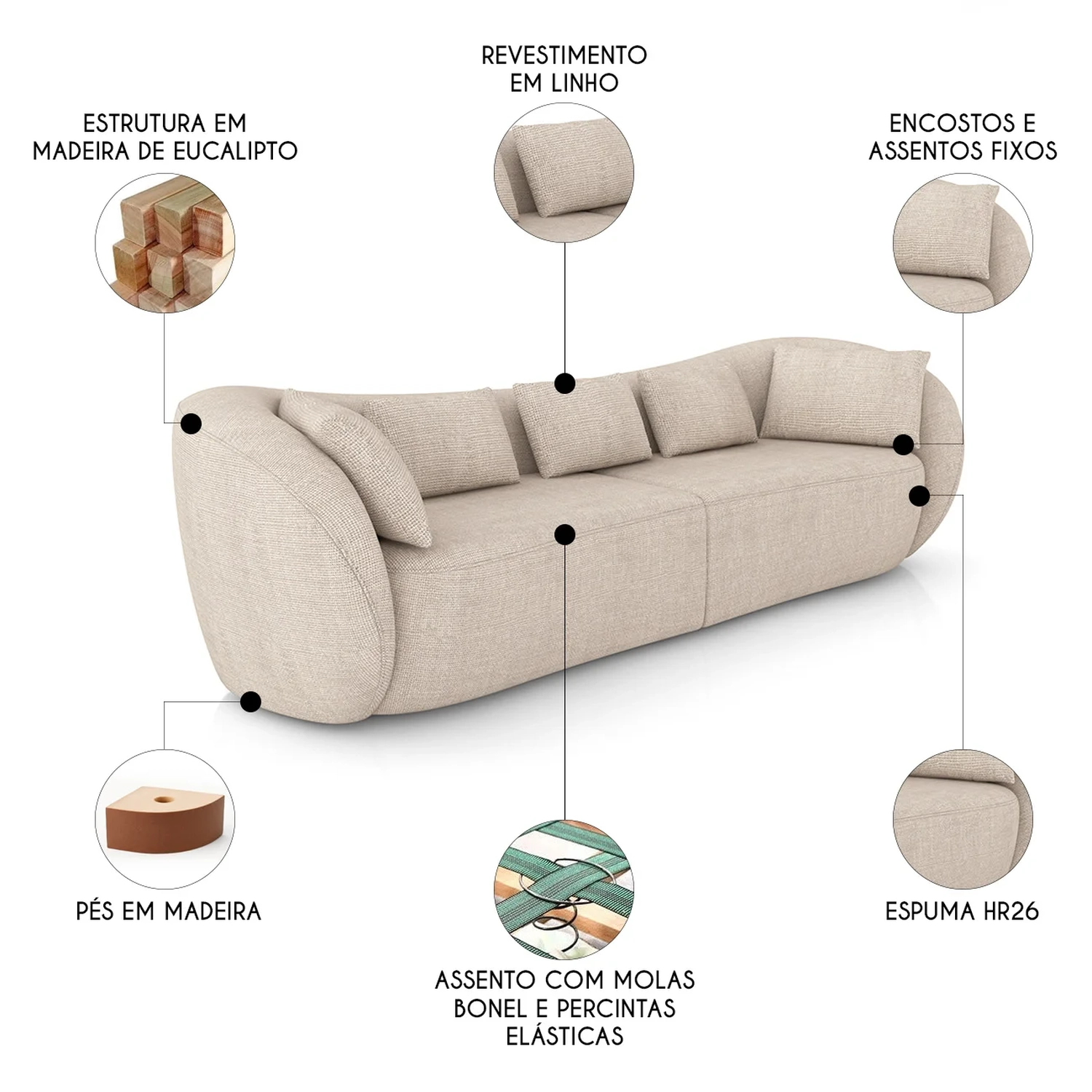 O assento do Sofá é composto por espuma HR26, molas bonel e percintas elásticas, oferecendo um toque macio com suporte reforçado para o uso diário.
