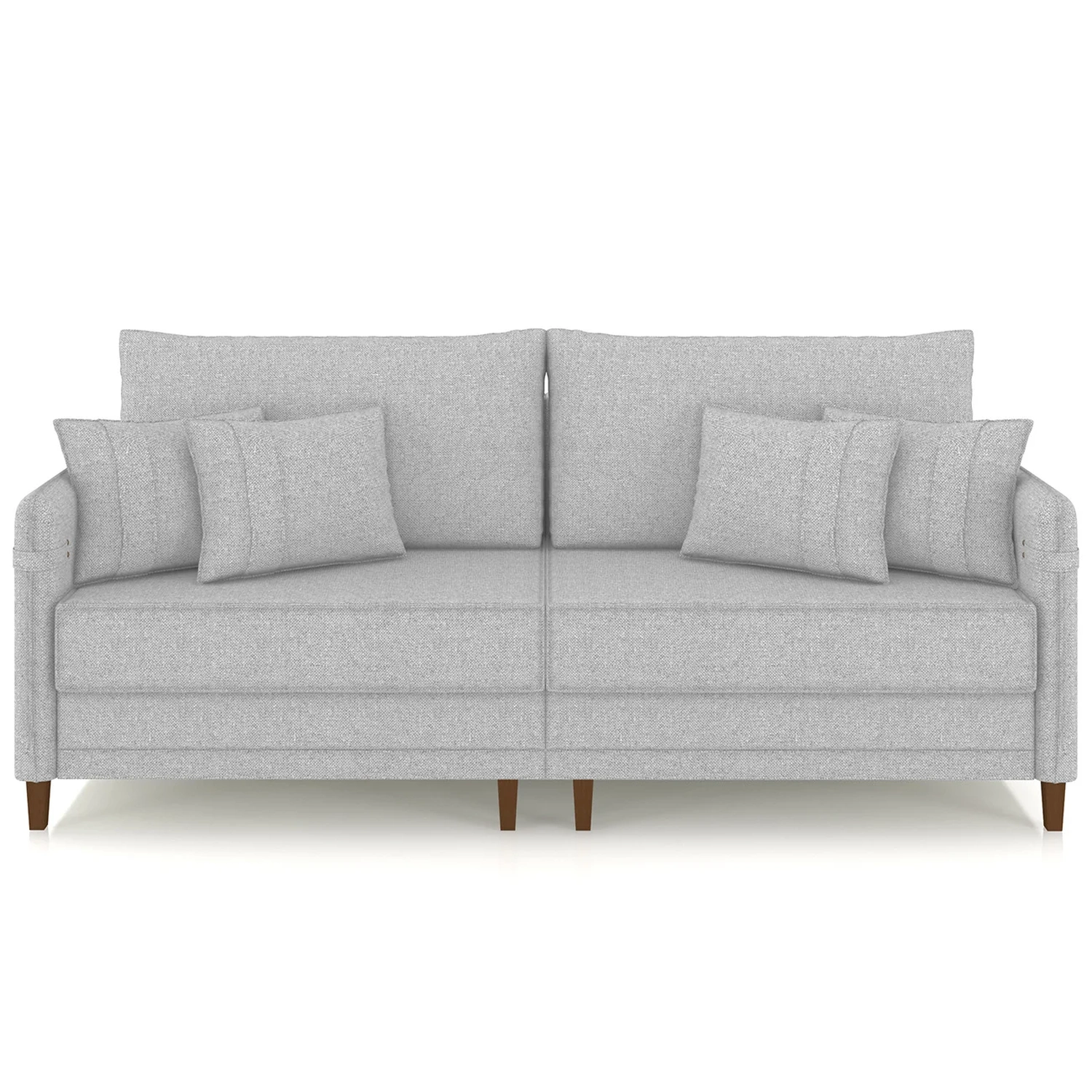 Com assento e encosto fixos, o Sofá Para Sala ainda conta com almofadas decorativas com fibra siliconada, pés em madeira e estrutura bipartida que facilita o transporte.