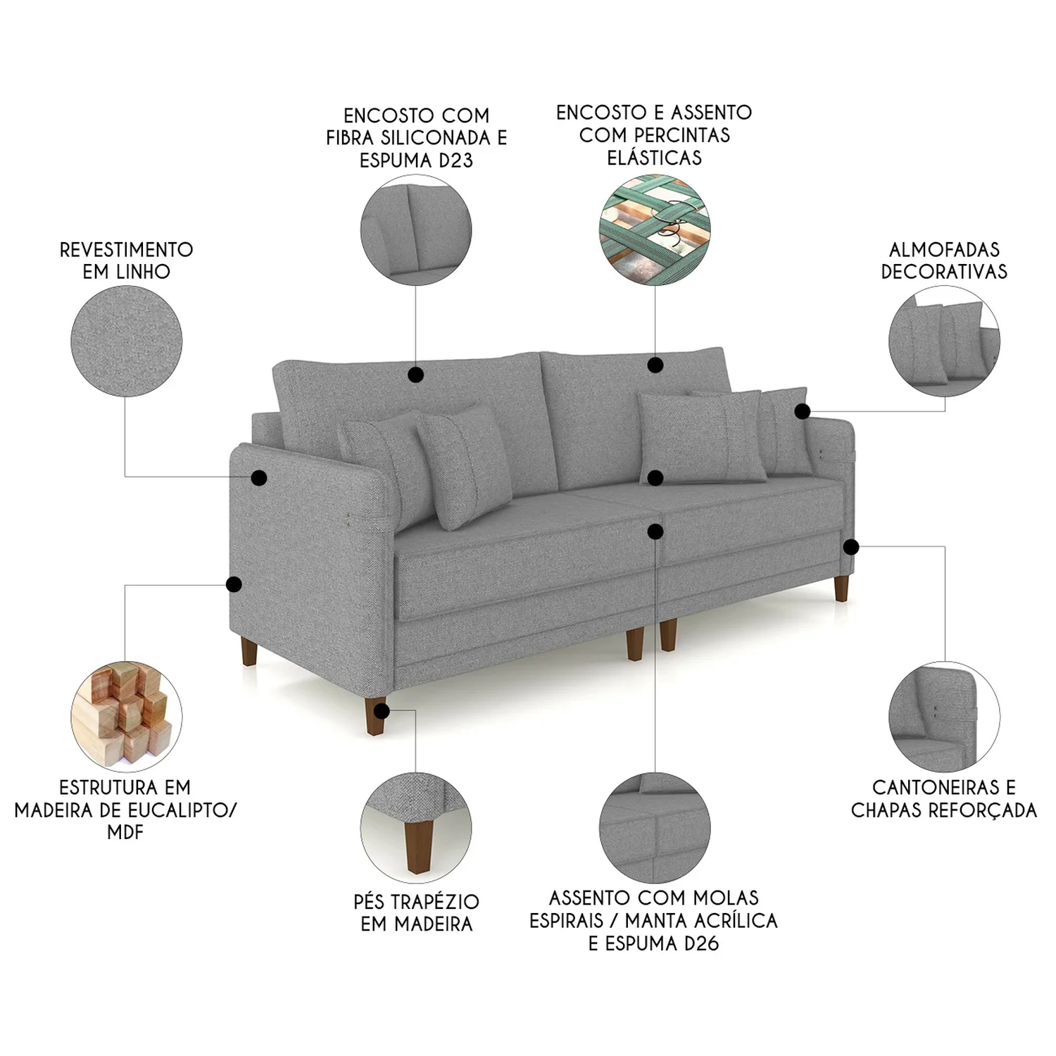 Sofá 3 Lugares Living 192cm Pé Madeira Zoe Linho Cinza Escuro Z08 - Mpozenato
