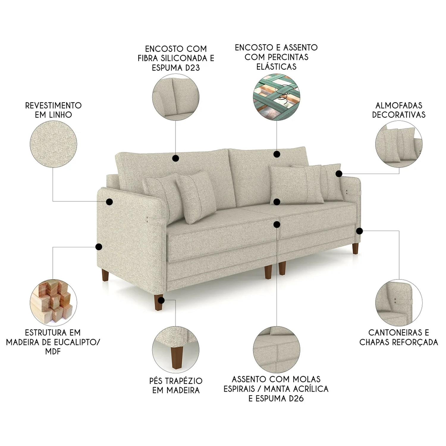 Sofá 3 Lugares Living 212cm Pé Madeira Zoe Linho Cru Z08 - Mpozenato