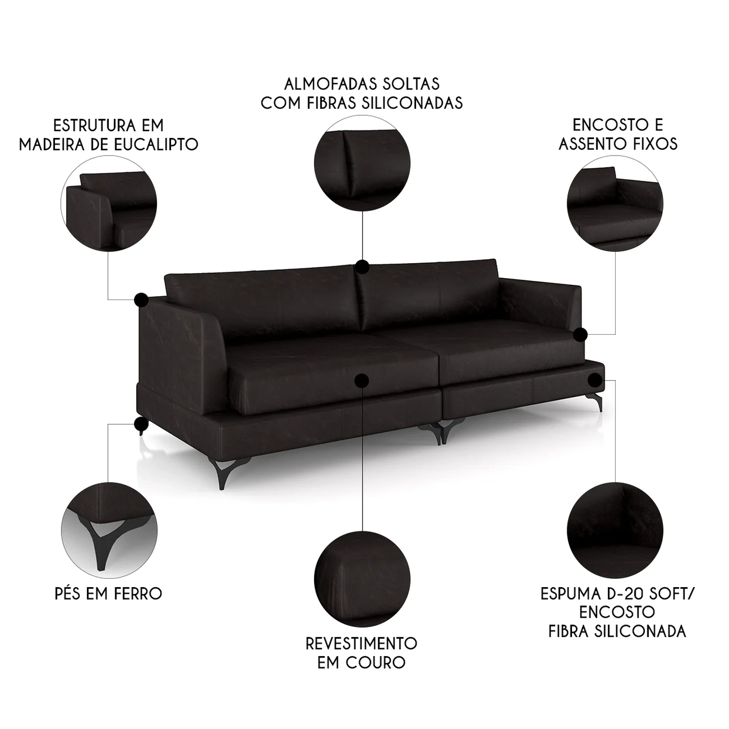 Revestido em couro 100% natural, esse Sofá Para Sala se destaca pelo design sofisticado, acabamento de excelência, conforto absoluto e pés fixos em ferro que acrescentam um toque industrial elegante.