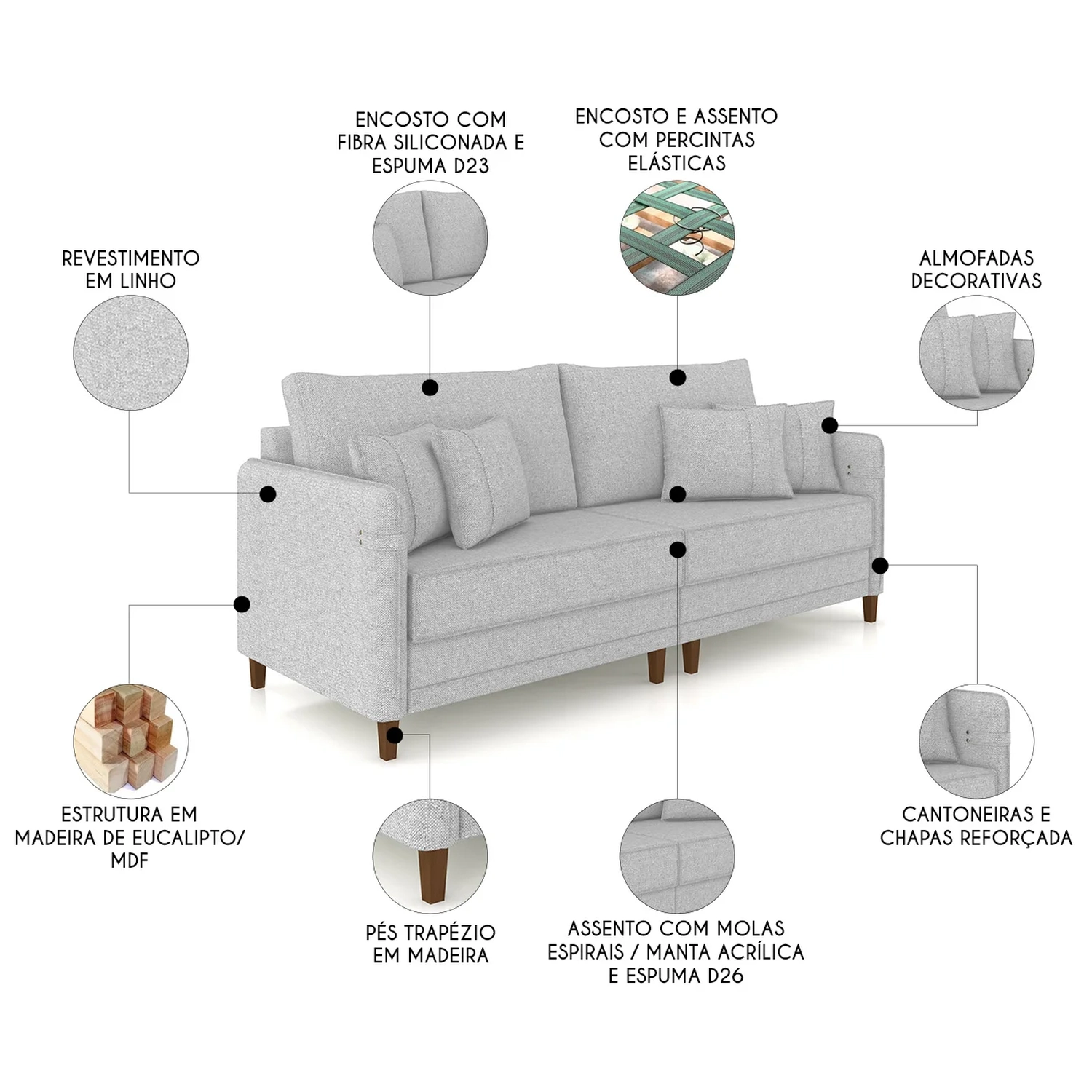 Com assento e encosto fixos, o Sofá Para Sala ainda conta com almofadas decorativas com fibra siliconada, pés em madeira e estrutura bipartida que facilita o transporte.