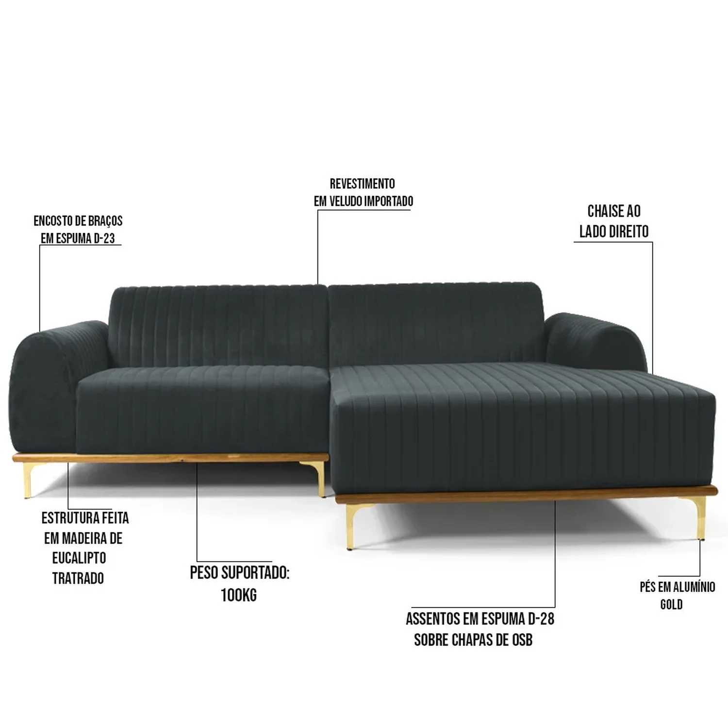 - Possui chaise na lateral direita, olhando de frente para o produto.