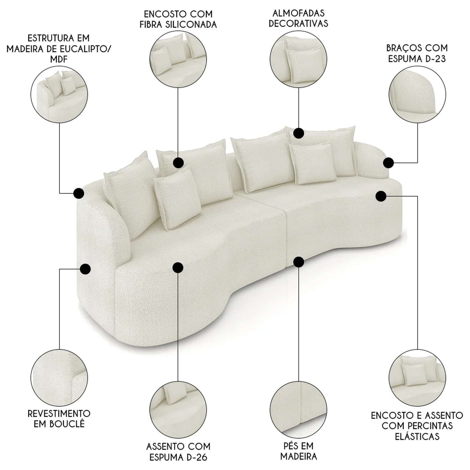 Material da Espuma: Assento espuma D-26 / Encosto fibra siliconada / Braços D-23.
