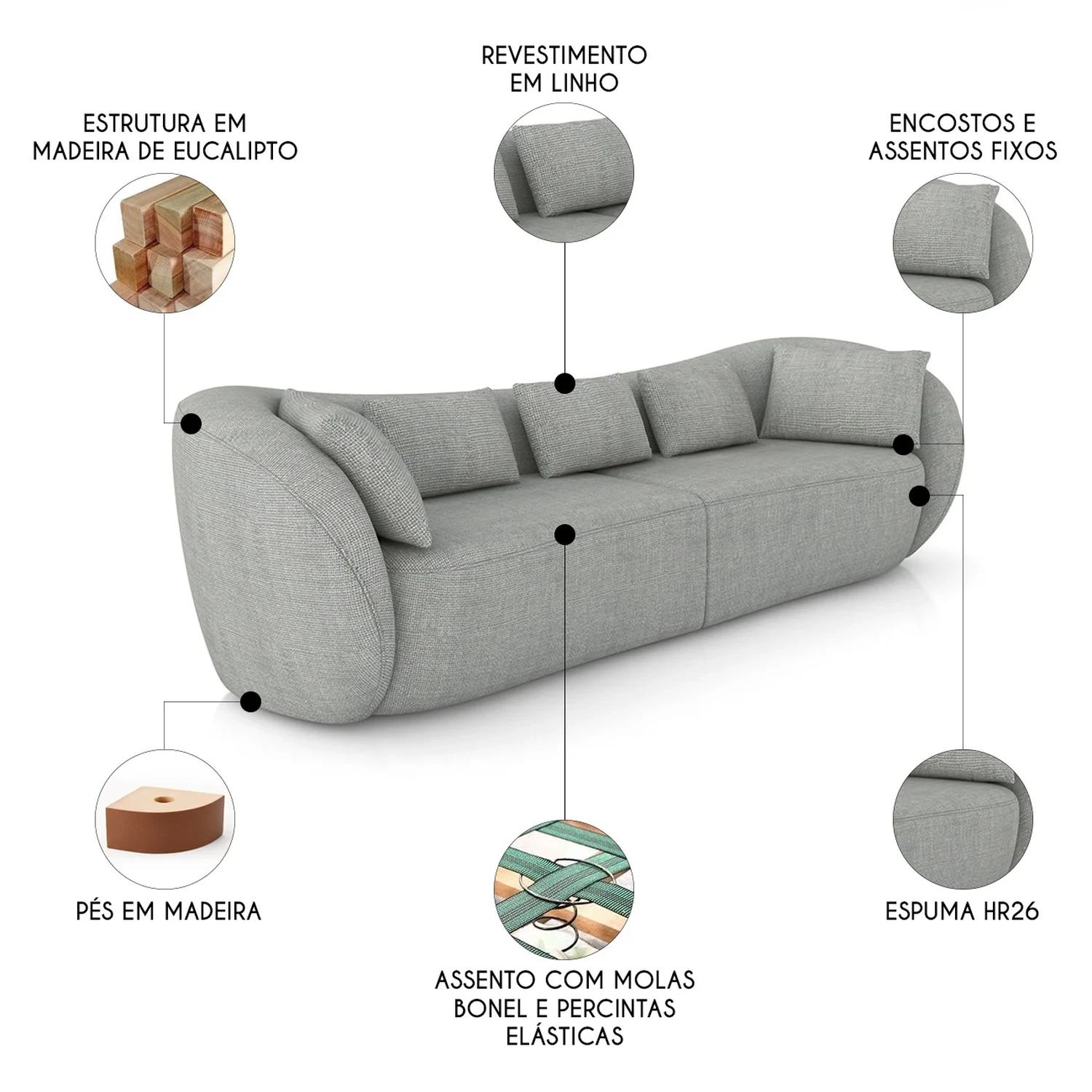 O assento do Sofá é composto por espuma HR26, molas bonel e percintas elásticas, oferecendo um toque macio com suporte reforçado para o uso diário.