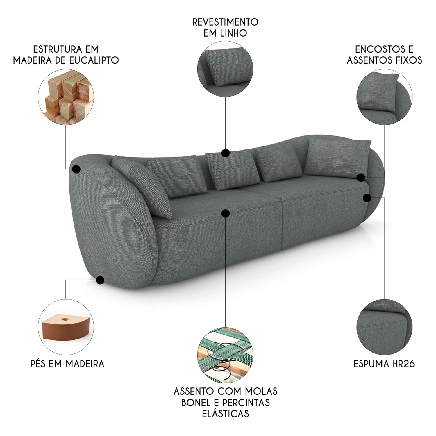 Sofá 4 Lugares 292cm Orgânico Pé Madeira Yume Linho Grafite Z55 - Mpozenato