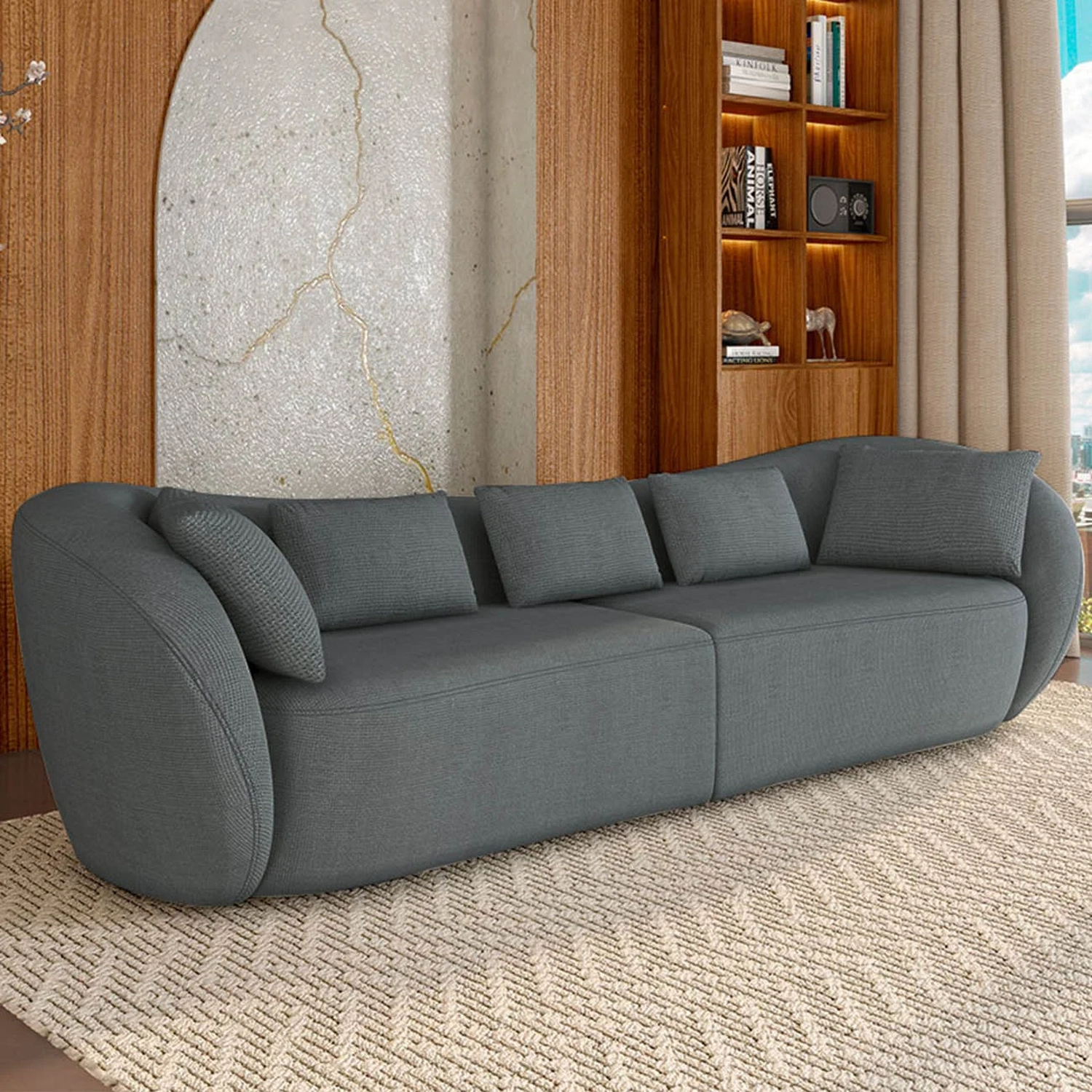Com design curvo e visual moderno, este Sofá 4 Lugares une conforto e sofisticação em cada detalhe. Seu formato orgânico cria um ambiente acolhedor e elegante.