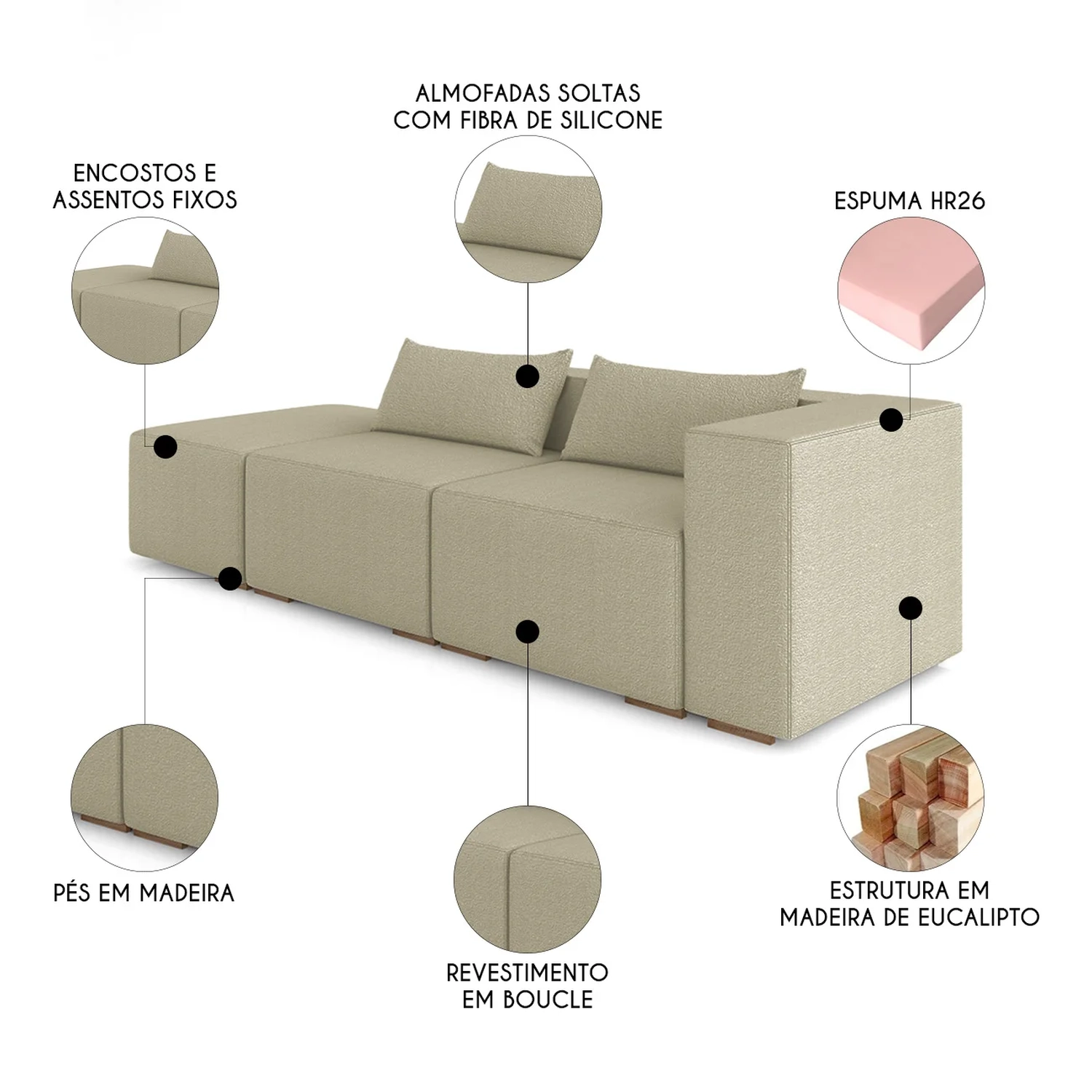 A estrutura em madeira 100% eucalipto garante resistência e longa vida útil. O encosto conta com percintas trançadas e almofadas soltas com fibra de silicone, proporcionando apoio ergonômico e acolhedor na Sala de Estar.