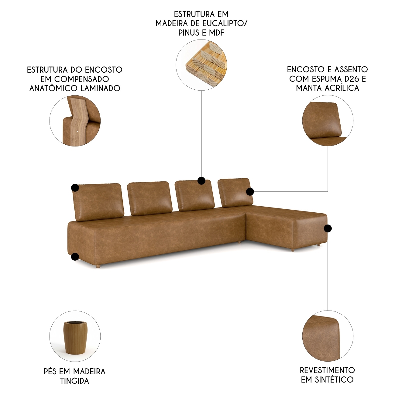 A composição do Sofá com Chaise combina madeira de reflorestamento, pinus, eucaliptus e MDF, formando estrutura firme e resistente. A união das peças valoriza o Design equilibrado e funcional.