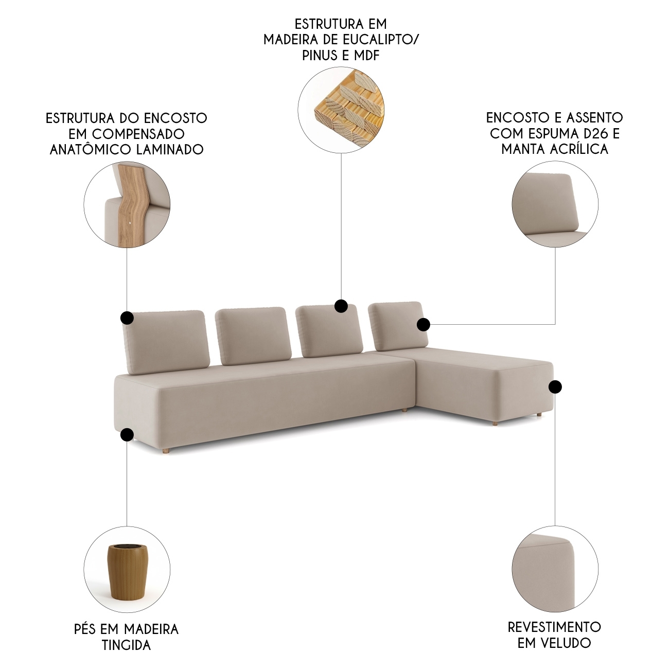 A composição do Sofá com Chaise combina madeira de reflorestamento, pinus, eucaliptus e MDF, formando estrutura firme e resistente. A união das peças valoriza o Design equilibrado e funcional.