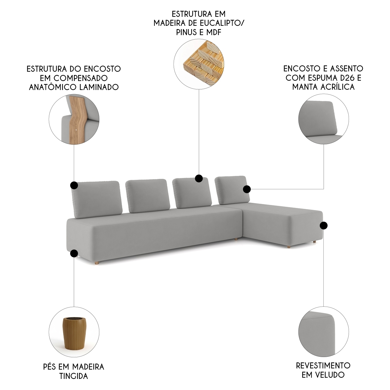 Sofá 4 Lugares Com Chaise 296cm Rovier Veludo Cinza Z32 - Mpozenato